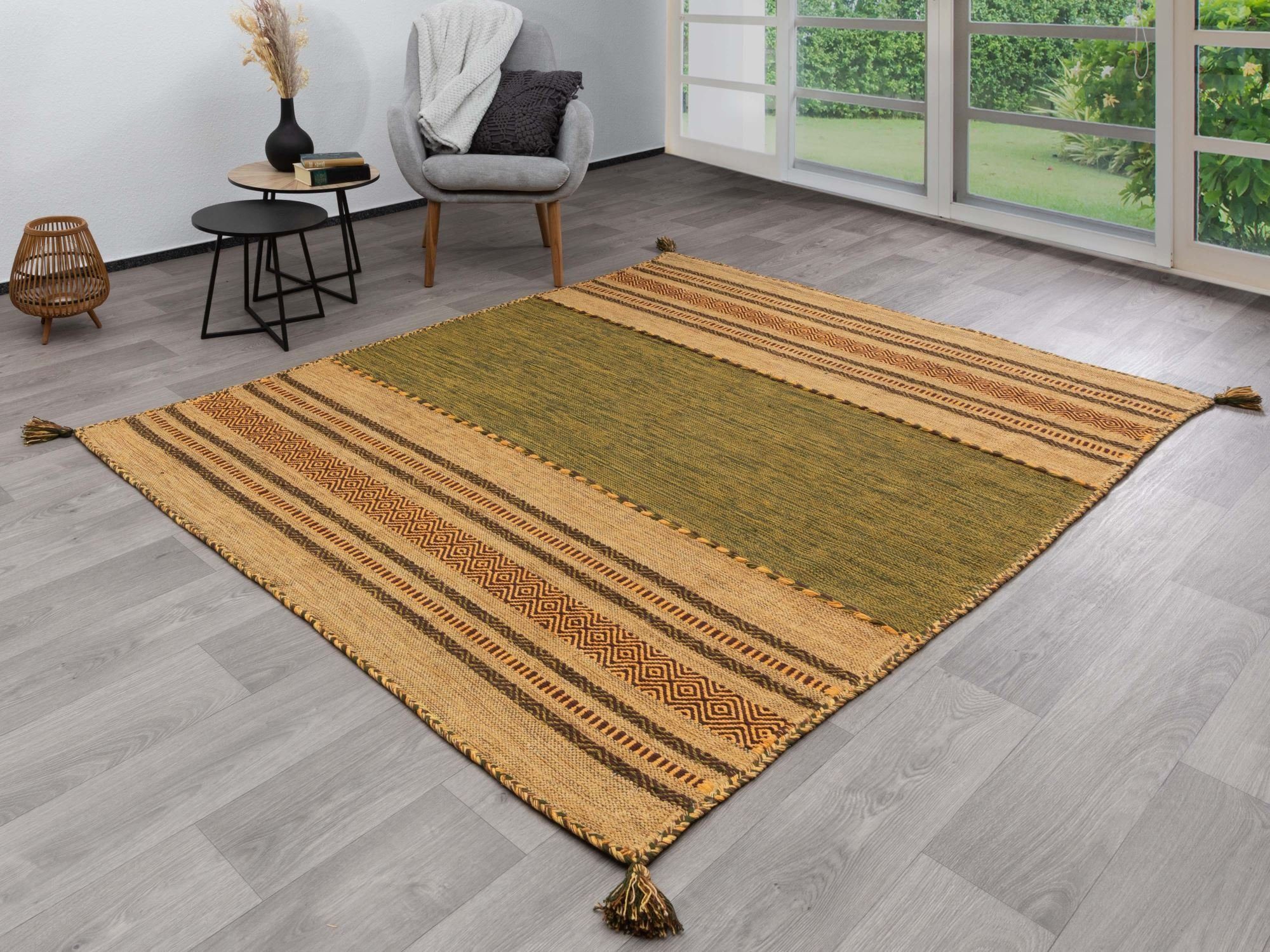 Aufwendig von Hand gewebter Baumwollteppich im Stil eines Kelim. Unkompliziert in Handhabung und Pflege und dennoch eine attraktive Zierde für den Raum. Seine Farben und Streifen erlauben ein kreatives Einrichten, wie z.B. ein Interieur im Ethno-Stil.