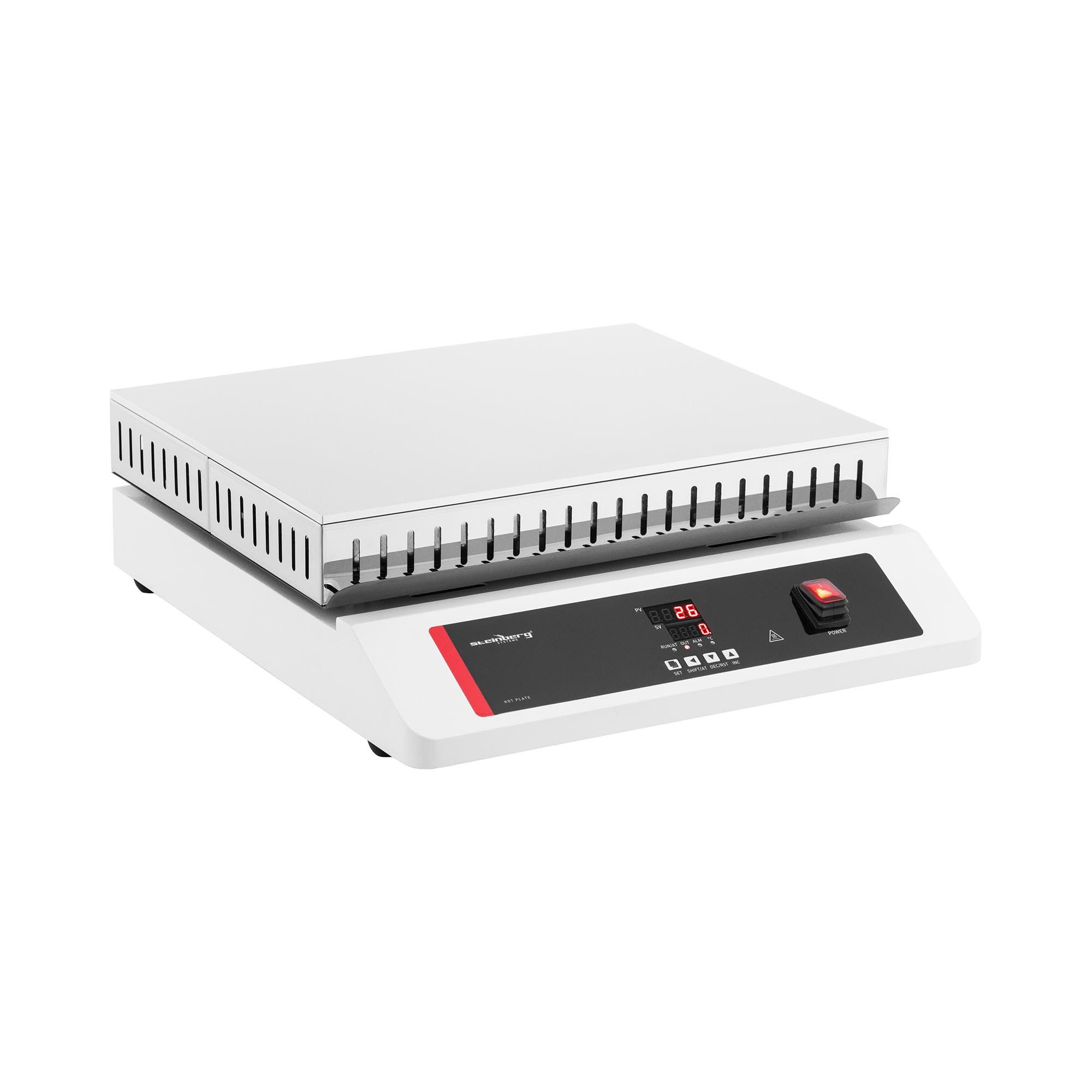 Mit den 45 x 35 cm bietet die Labor Heizplatte Platz für verschiedene Gefäße wie Erlenmeyer- oder Rundkolben. Die glatte Oberfläche aus Aluminium ist leicht zu reinigen und besonders widerstandsfähig gegenüber äußeren Einflüssen – ebenso wie die robuste Basis aus Eisen. Dank dieser stabilen Konstruktion sowie der hochwertigen Verarbeitung trägt die Laborheizplatte ein Gewicht von bis zu 30 kg.