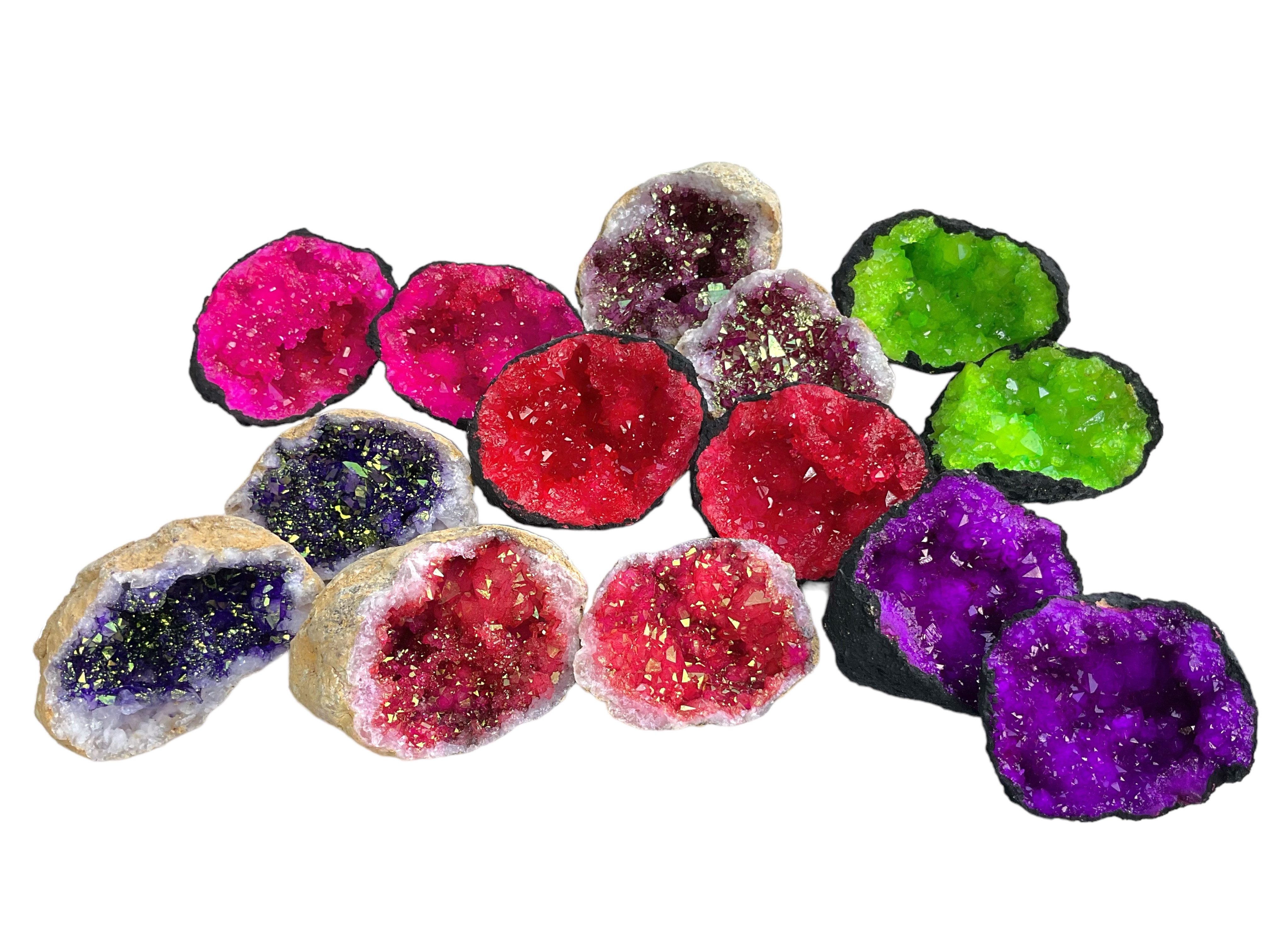 Sie erhalten wunderschöne, faszinierende, bereits geknackte Geoden. Die Geoden wurden in Handarbeit eingefärbt. Je nach Варианты, 7 verschiedene Farben: Titanium rot, Rot, Pink, Titanium lila, Lila, Limette und Titanium violett. Titanium Kristalle (Titanium rot, Titanium lila und Titanium violett) entstehen bei Temperaturen um 1600º F (871º C ), wenn diese im Vakuum mit reinem Gold oder z.B. Platinum bedampft (iridiert) werden. Dabei geht das Gold oder Platinum innerhalb von 3 Tagen eine dauerhafte Verbindung auf molekularer Ebene mit der Kristalloberfläche ein und verleiht dem Kristall seine leuchtende Farbe. Die Geoden mit den Farben Rot, Pink, Lila und Limette wurden außen schwarz eingefärbt und färben leicht ab. Das magisches Farbenspiel entfaltet sich beim öffnen der bereits geknackten Geoden. Die Kristalle wurden nicht bearbeitet, funkeln deswegen besonders schön. Размер des Geodenpaares ca. 60-70 mm und Gewicht ca. 130-280 Gramm. Geoden zählen zu den Glückssteinen. Holen Sie sich Ihr Glück nach Hause.