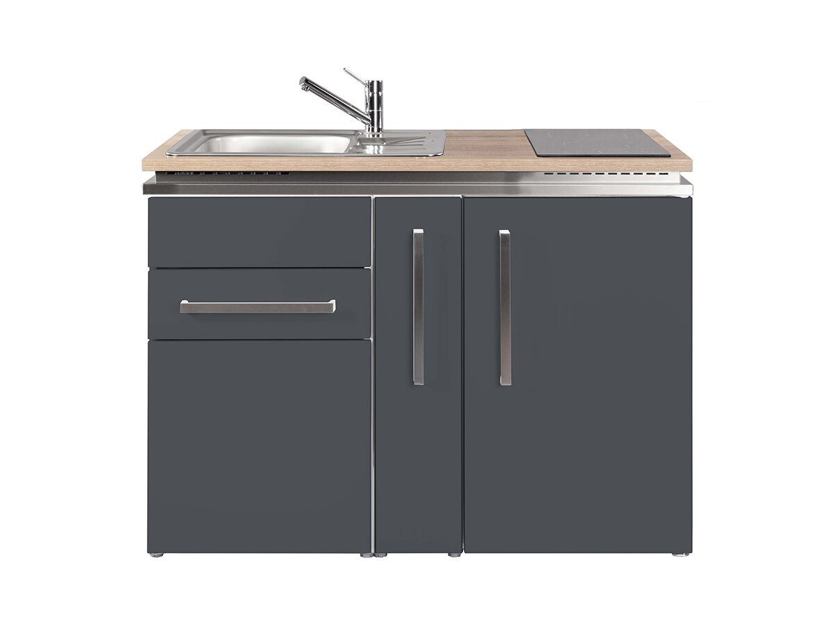 Die Miniküche MD 120 A im linken Unterbau eine Schublade und eine Tür. Nebendran befindet sich ein praktischer Ausziehschrank der mit 2 Schalen ausgestattet werden kann. Die Unterbauten sind aus pulverbeschichteten, doppelwandigen Metall-Premiumfronten und die Schublade ist mit der Softclose-Technologie ausgestattet. Die Küche hat die Abmessung von (LxTxH) 120 x 60 x 90 cm.