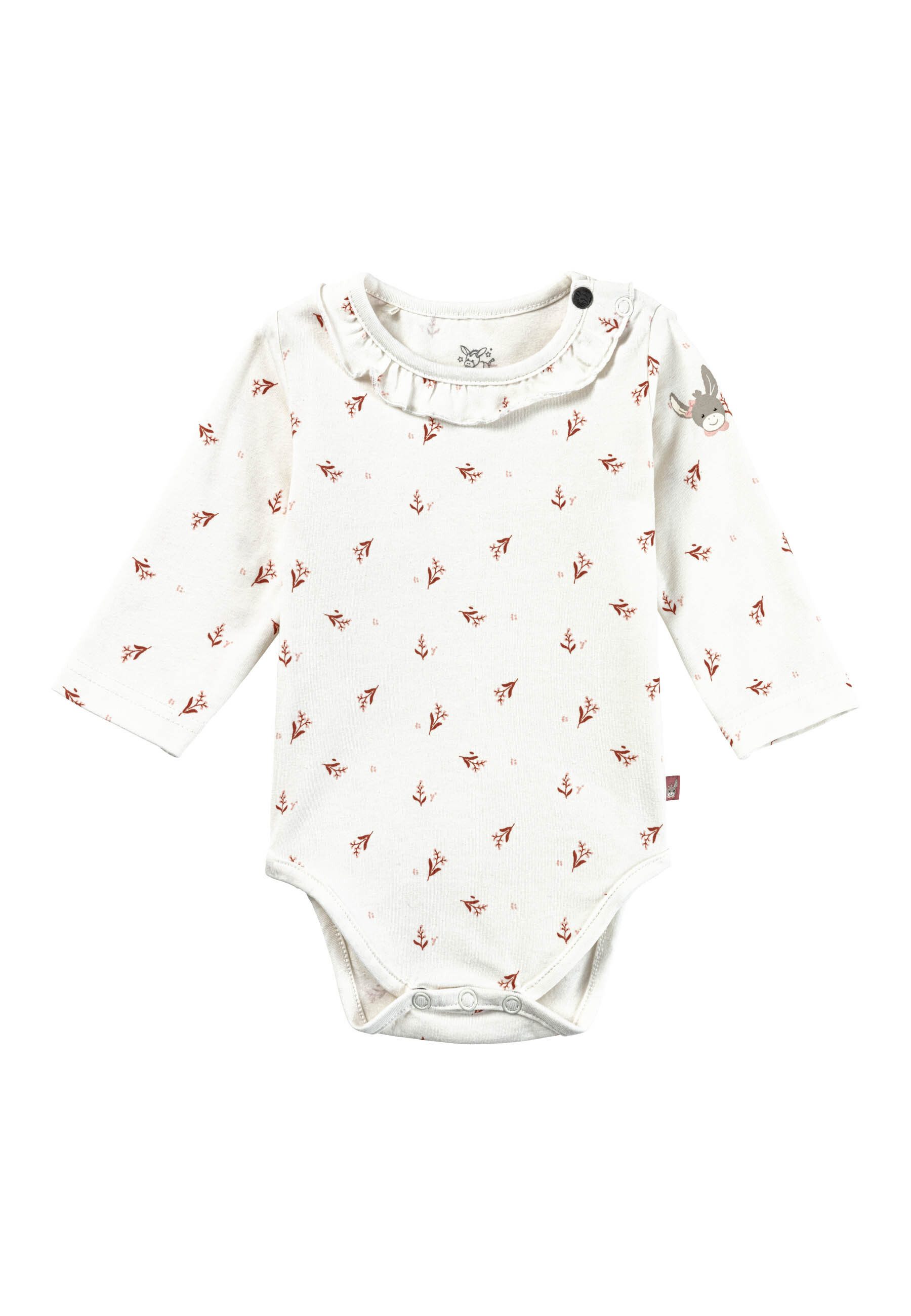 Sterntaler® Langarm-Body Blümchen Langarmbody aus Baumwolljersey, praktische Schulterknöpfung für erleichtertes an- und ausziehen, im Schritt geknöpft, mit Druckmotiv bedruckt mit Blümchen, dekorative Volants am Halsausschnitt, Druckmotiv Esel Emmi Girl am linken Ärmel, Schrittnaht und Schulter geknöpft