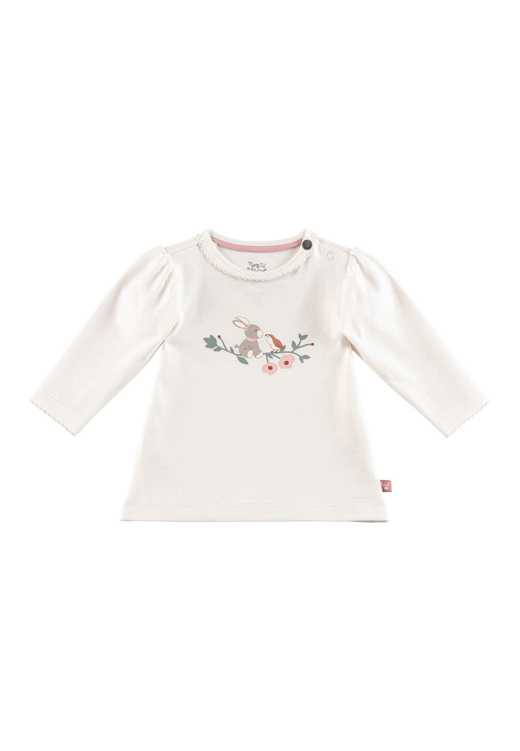 Stil | unifarben, mit Druckmotiv Esel Emmi und Vogel, Puffärmelchen, dekorative Häkelkanten, Schulterknöpfung links |