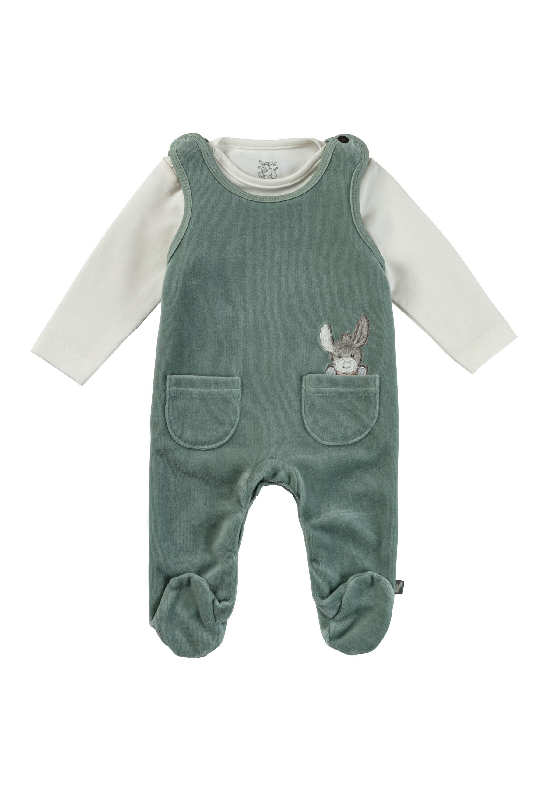 Applikationen | Strampler: unifarben, zwei aufgesetzte Taschen vorne und Applikation Esel Emmi, Shirt: unifarben |