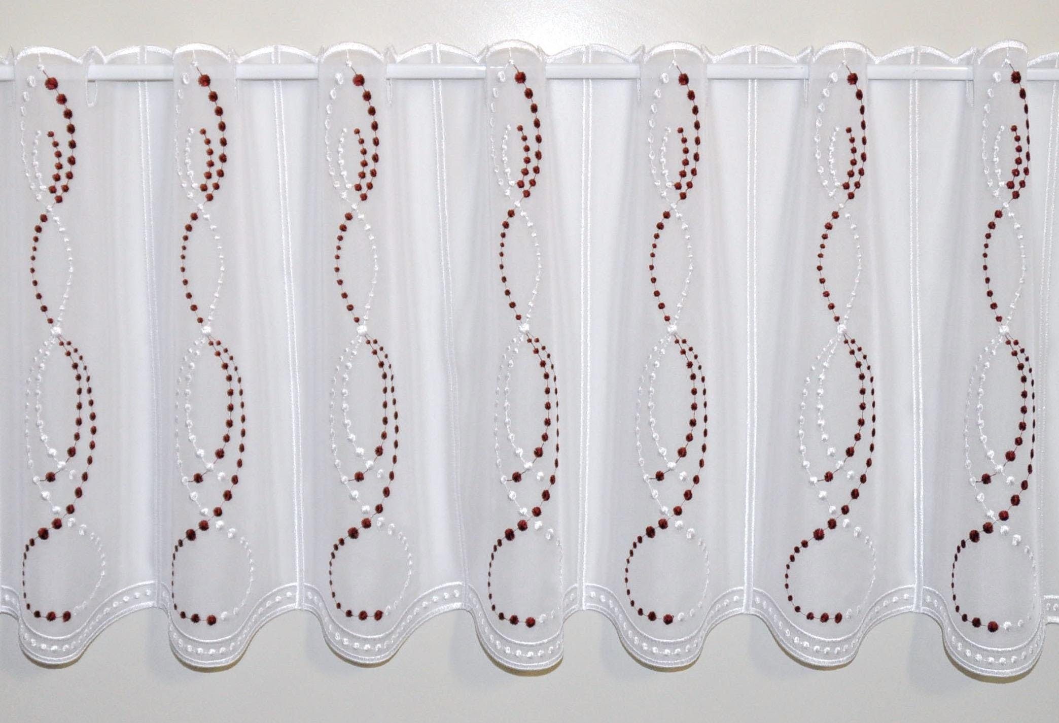 Gardine ist ein wirklicher Blickfang: edles Muster, gute Verarbeitung, Ränder eingefasst. Die Farbe der "Perlen" (bordeaux) kommt allerdings bei Tageslicht weniger zur Geltung, ist also keinesfalls aufdringlich. Klare Kaufempfehlung!