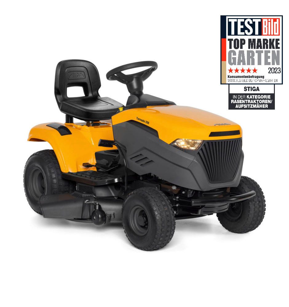 Der Tornado 398 ist ein kompakter und leicht zu bedienender Rasentraktor mit einer Schnittbreite von 98 cm. Er basiert auf einem stabilen Rohrrahmen. Angetrieben wird er von einem 432 cm³ STIGA ST 500 Motor, mit einer Leistung von 7,5 kW / 10,2 PS. Der Tornado 398 ist mit seiner Schnittbreite von 98 cm und seinem komfortablen Hydrostatgetriebe ideal für Grünflächen von bis zu 5000 m². Der Tornado 398 kann wahlweise im Seitenauswurf- oder, mit dem optional erhältlichem Mulchkit, im Mulchmodus verwendet werden. Im Seitenauswurfmodus wird das Schnittgut seitlich abgelegt. Im Mulchmodus werden die Grashalme mehrmals im Mähdeck so fein zerschnitten, dass sie zwischen die Halme auf die Grasnarbe fallen. Dort verrotten sie schnell und wandeln sich in die natürlichsten Nährstoffe um, die sich ein Rasen wünschen kann. Das Ergebnis ist ein grüner und gesunder Rasen! Abgerundet wird die Ausstattung des Tornado 398 durch die Elektromagnetkupplung für das Mähdeck, eine siebenstufige Schnitthöheneinstellung von 25 bis 80 mm, einem ergonomisch einstellbaren Fahrersitz sowie einem Soft Grip Lenkrad. Mit dem als Zubehör erhältlichem Schneeräumschild kannst Du diesen Rasentraktor auch für den Winterdienst nutzen. Dank der Scheinwerfer ist das Arbeiten auch in der Dämmerung möglich. Mulchkeil nicht im Lieferumfang enthalten.