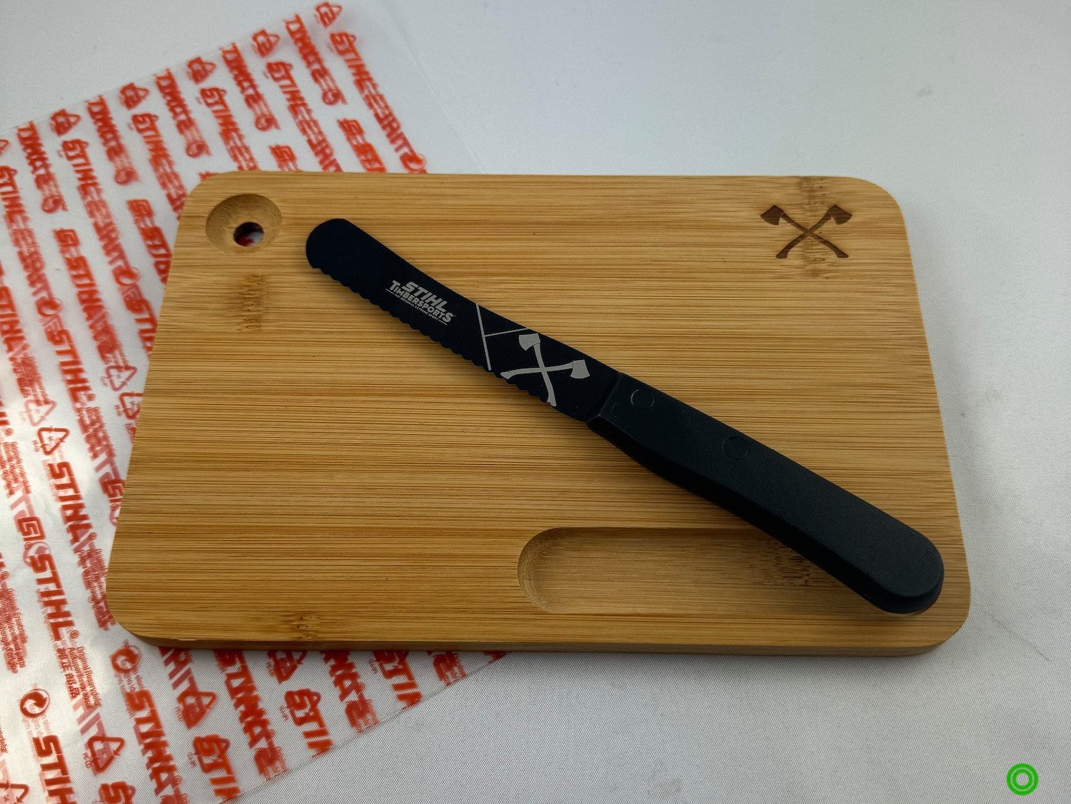 In dieses Schneidebrett sind die für TIMBERSPORTS typischen gekreuzten Äxte gefräst.