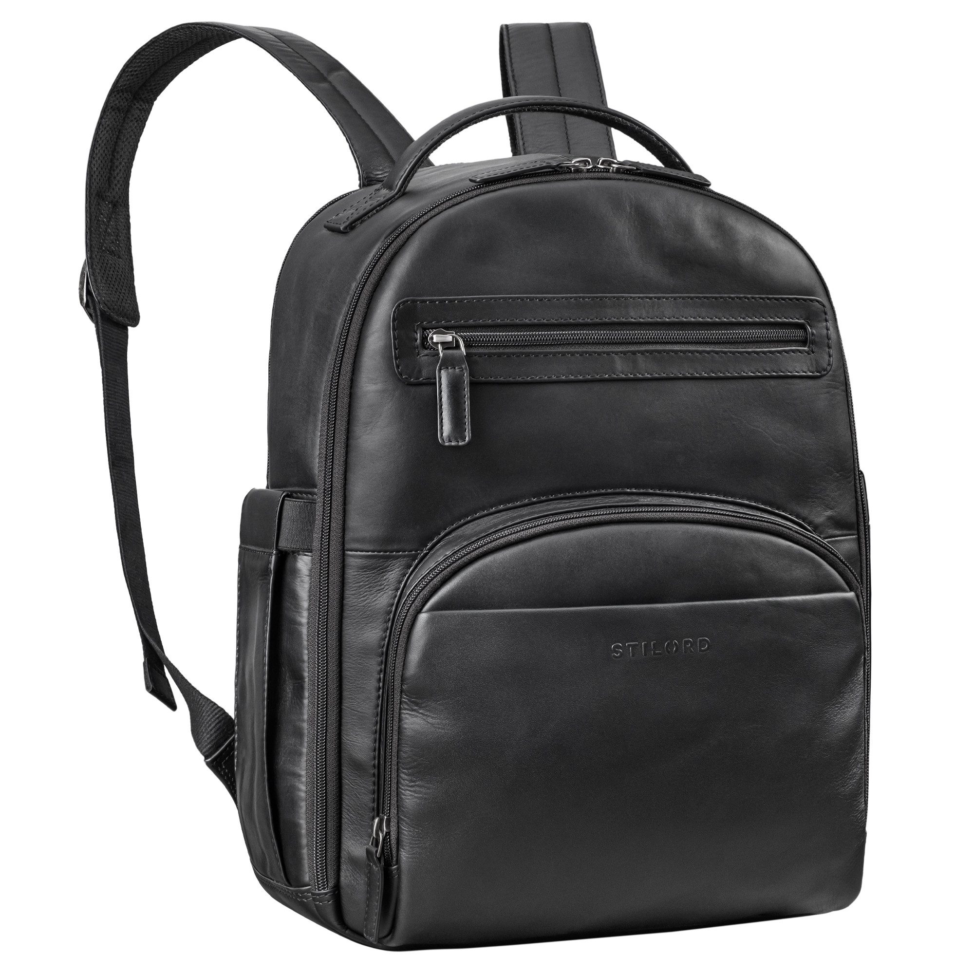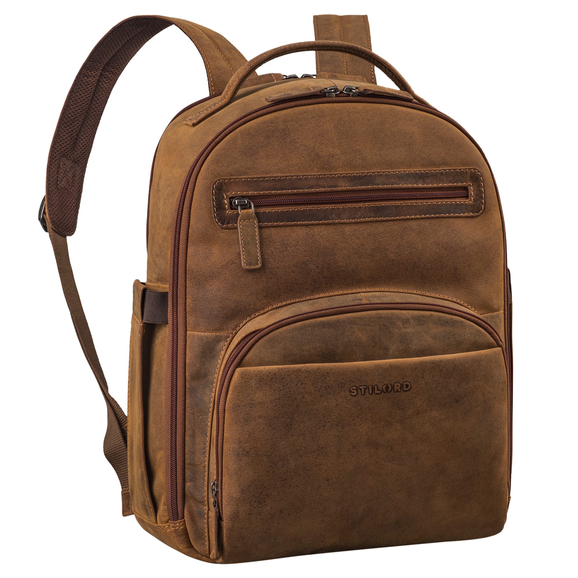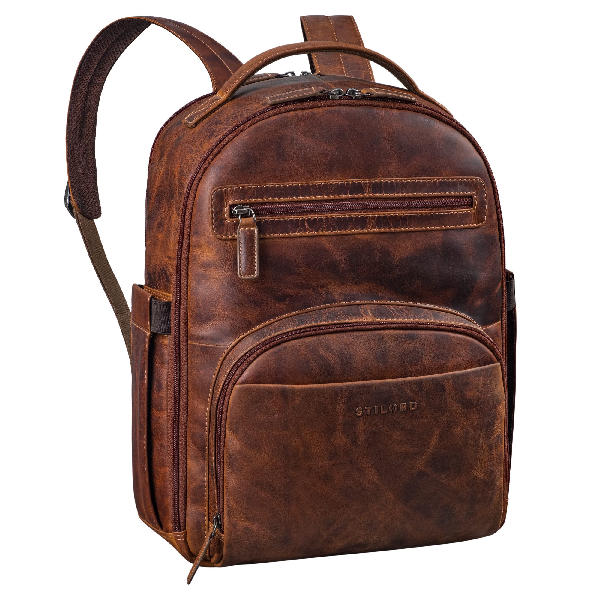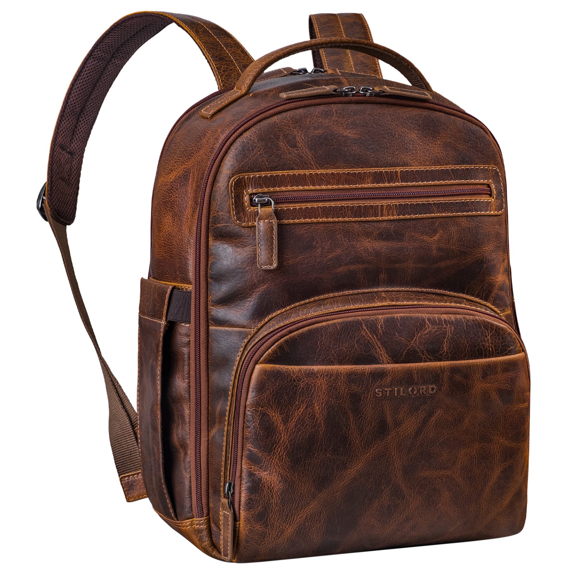 Durch seine umlaufenden Reißverschlüsse und den vielen Fächern bietet der elegante Vintage Lederrucksack einen tollen Begleiter mit sehr viel Platz. Ob als Arbeitsrucksack, Office-Rucksack Herren oder auf Reisen, als Herren Reiserucksack Leder. Der elegante Männer-Multifunktions-Rucksack hat ein atmungsaktives Rückennetz, für eine gute Rückenbelüftung, dort sitzt auch eine Trolley-Halterung am Vintage Männer Leder-Rucksack. Ergänzt wird das XL Platzangebot durch ein gepolstertes Laptopfach, in dem Sie ein 15,6 Zoll Notebook sicher verstauen können. Der Büro Rucksack bietet eine gute Verstaumöglichkeit mit beidseitigen Seitenfächern für eine 1L - Wasserflasche. Die praktischen Reißverschlussfächer auf der Vorderseite, bieten nicht nur Platz für alles, was Sie schnell zu Hand haben möchten, sondern verleiht dem Rucksack auch seinen einzigartigen Vintage-Charme.