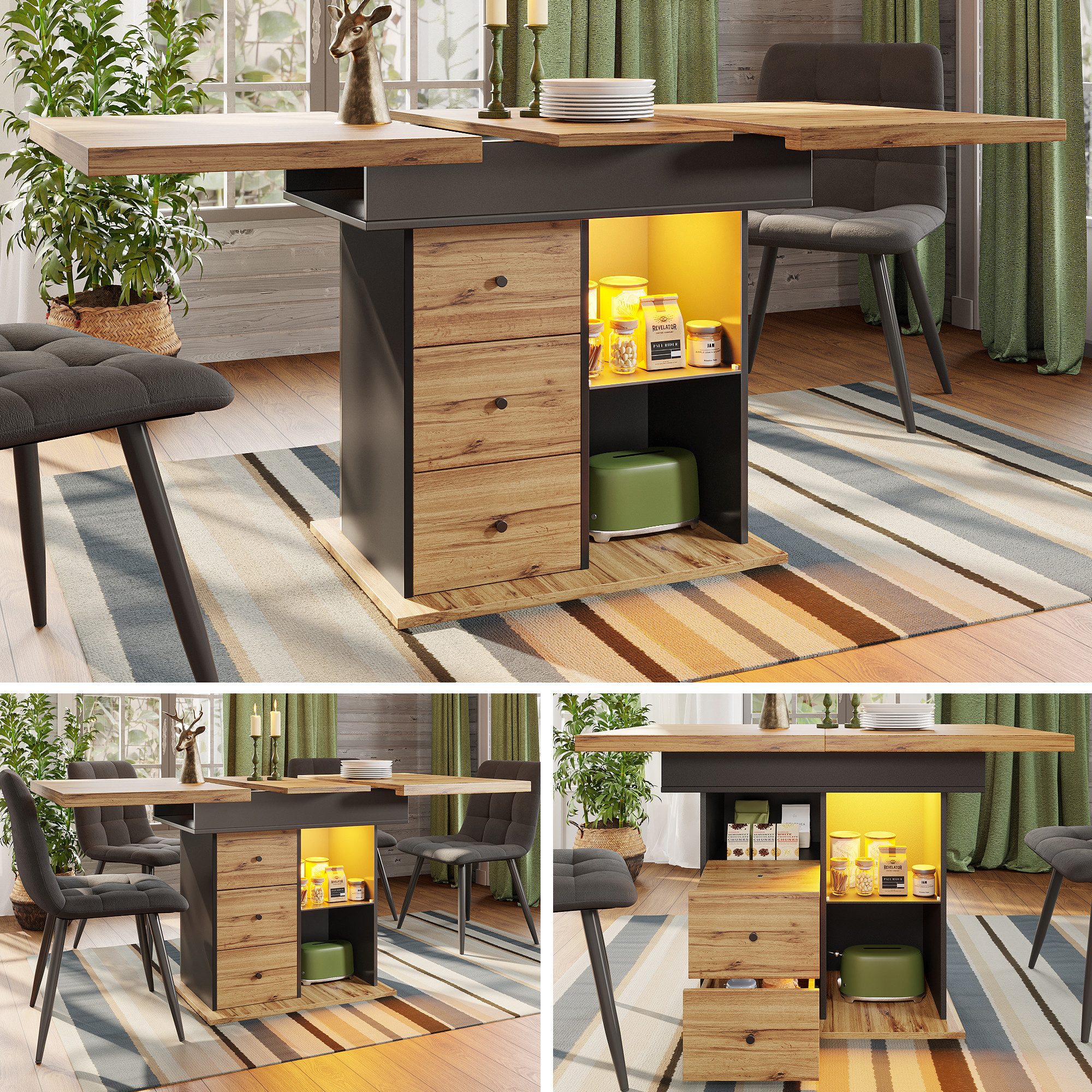 Das innovative 3-Schritte-System (Ziehen – Einsetzen – Schieben) ermöglicht eine einfache und schnelle Größenanpassung. Vom kompakten Arbeitsplatz bis zur großen Festtafel passt sich der Tisch spielend Ihren Bedürfnissen an und optimiert die Raumausnutzung.