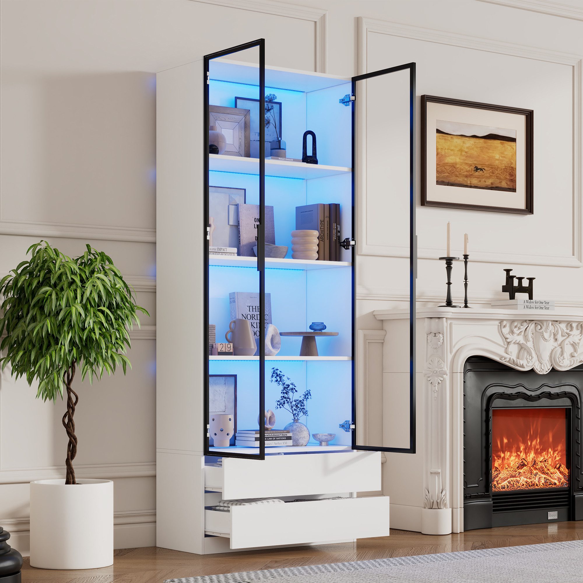 Die Vitrine kombiniert Glastüren, markante Aluminiumrahmen und App-steuerbare LED-Beleuchtung – eine Kombination, die Sammlungen, Dekorationsobjekte oder wertvolle Kleinigkeiten stilvoll in Szene setzt. Die transluzente Glasstruktur lässt den Inhalt sichtbar werden, ohne Türen öffnen zu müssen, während die LED-Licht ein gezieltes Highlight setzt: Warmes Licht betont Texturen und Farben, kühles Licht verstärkt ein modernes Gefühl. Dadurch wird die Vitrine nicht nur zum Stauraum, sondern zu einem dekorativen Element, das den Raum mit einer warmen, zeitgemäßen Atmosphäre bereichert.