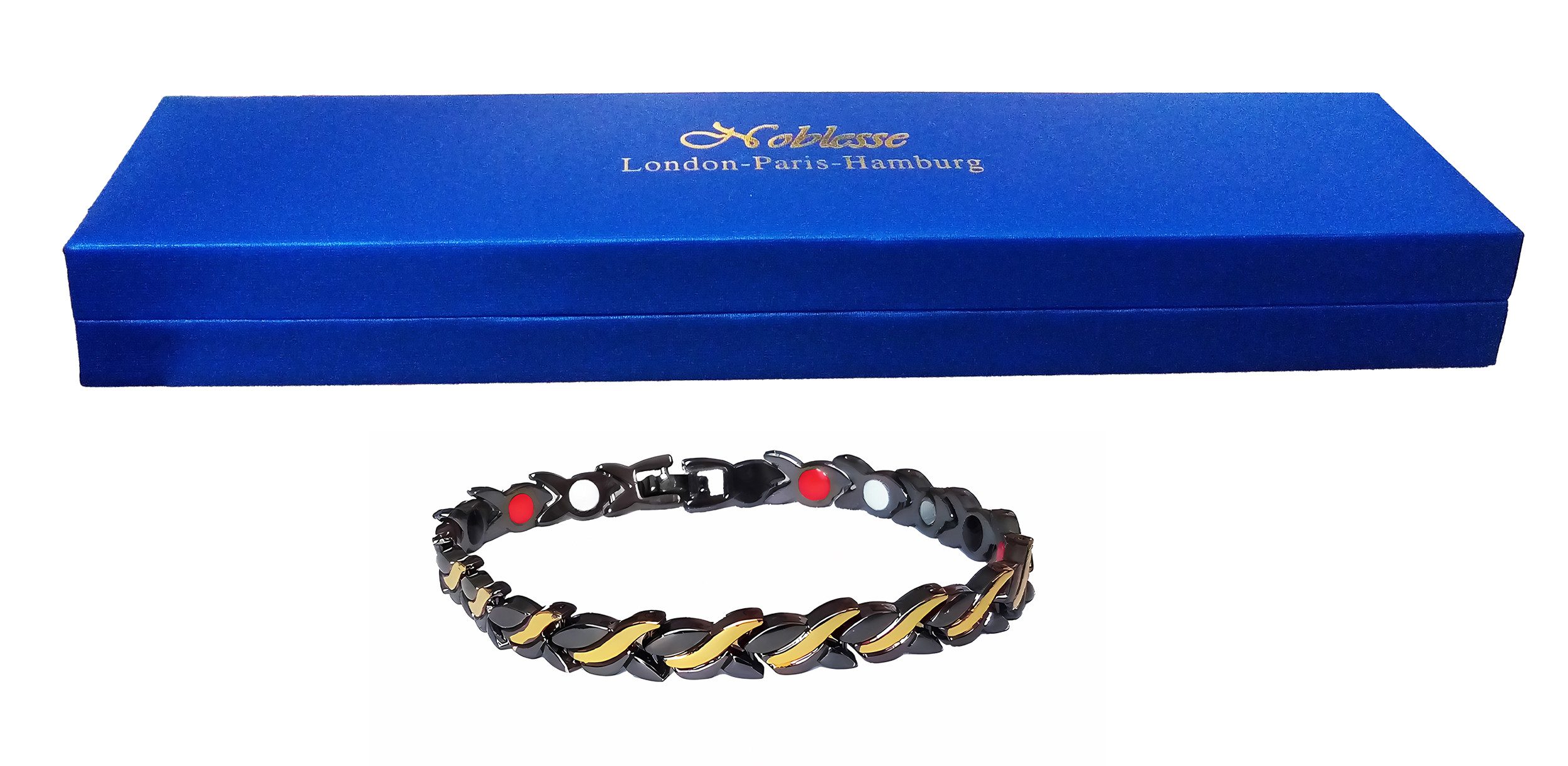 Produktdetails: - Material: Hochwertige Metalllegierung - Длина: 195 mm, individuell anpassbar durch Herausnahme einzelner Gewinde - Breite: 5 mm - mit 4 Magnete - Magnetkraft: 1500 Gauss - Design: Zweifarbig (Gold / Schwarz), modern und schlicht - Verschluss: Sicherer und komfortabler Schnappverschluß - im Geschenk-Etui (Farbe: Blau; Motiv: Noblesse, London-Paris-Hamburg; Größe: ca. 22,5 x 5,2 x 2,5 cm (L/T/H))