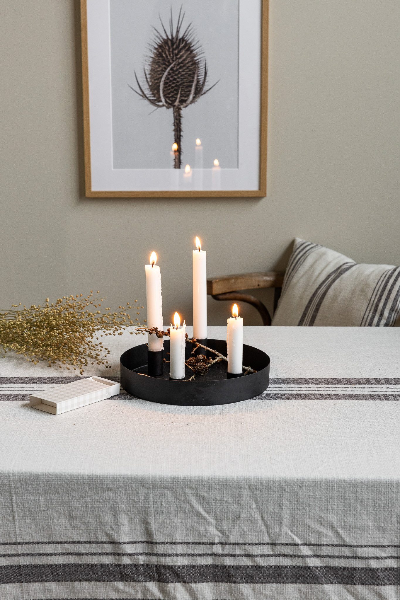 SUND, jetzt auch in kleinerer, runder Ausführung erhältlich, ist ein eleganter Kerzenständer aus Metall. Dank der magnetischen Kerzenhalter können Sie das Aussehen des Kerzenständers ganz nach Ihren Wünschen gestalten. Füllen Sie ihn mit Blumen, Tannenzapfen, Steinen oder Moos, um Ihr eigenes saisonales Arrangement zu kreieren. Heben Sie Ihre Kerzenhalter beim Bewegen unbedingt an, um Kratzer auf Ihrem Kerzenständer zu vermeiden. Wichtig: Aus Sicherheitsgründen sollten die Kerzenhalter immer mindestens 7 cm Abstand zueinander und zur Wand haben. Lassen Sie eine brennende Kerze niemals unbeaufsichtigt.