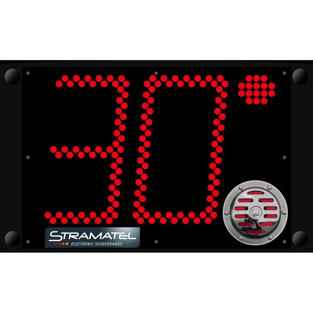 Die 30-Sekundenanlage "SCX30" von Stramatel dient zur Anzeige der 30 Sekunden-Angriffszeit beim Wasserball laut Regeln des internationalen Verbandes. Neu: seit 2019 lässt sich die Angriffszeit auch auf 20 Sekunden bei Fehlern, Eckball, Einwurf oder geblocktem Torwurf umschalten.