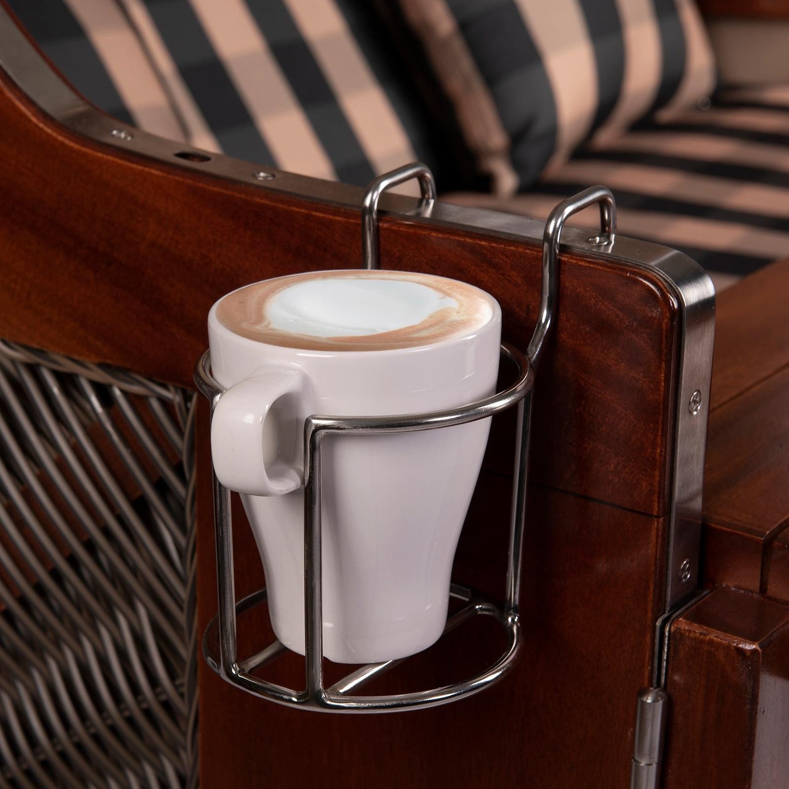 Das schlichte und elegante Design fügt sich nahtlos in jedes Strandkorb-Interieur ein und verleiht ihm eine zusätzliche Note von Klasse. Der Tassenhalter ist aus robustem Edelstahl gefertigt, was ihn besonders langlebig und stabil macht. So können Sie sicher sein, dass Ihre Getränke immer sicher und griffbereit sind, egal ob Sie im Garten, auf dem Balkon oder am Strand entspannen.