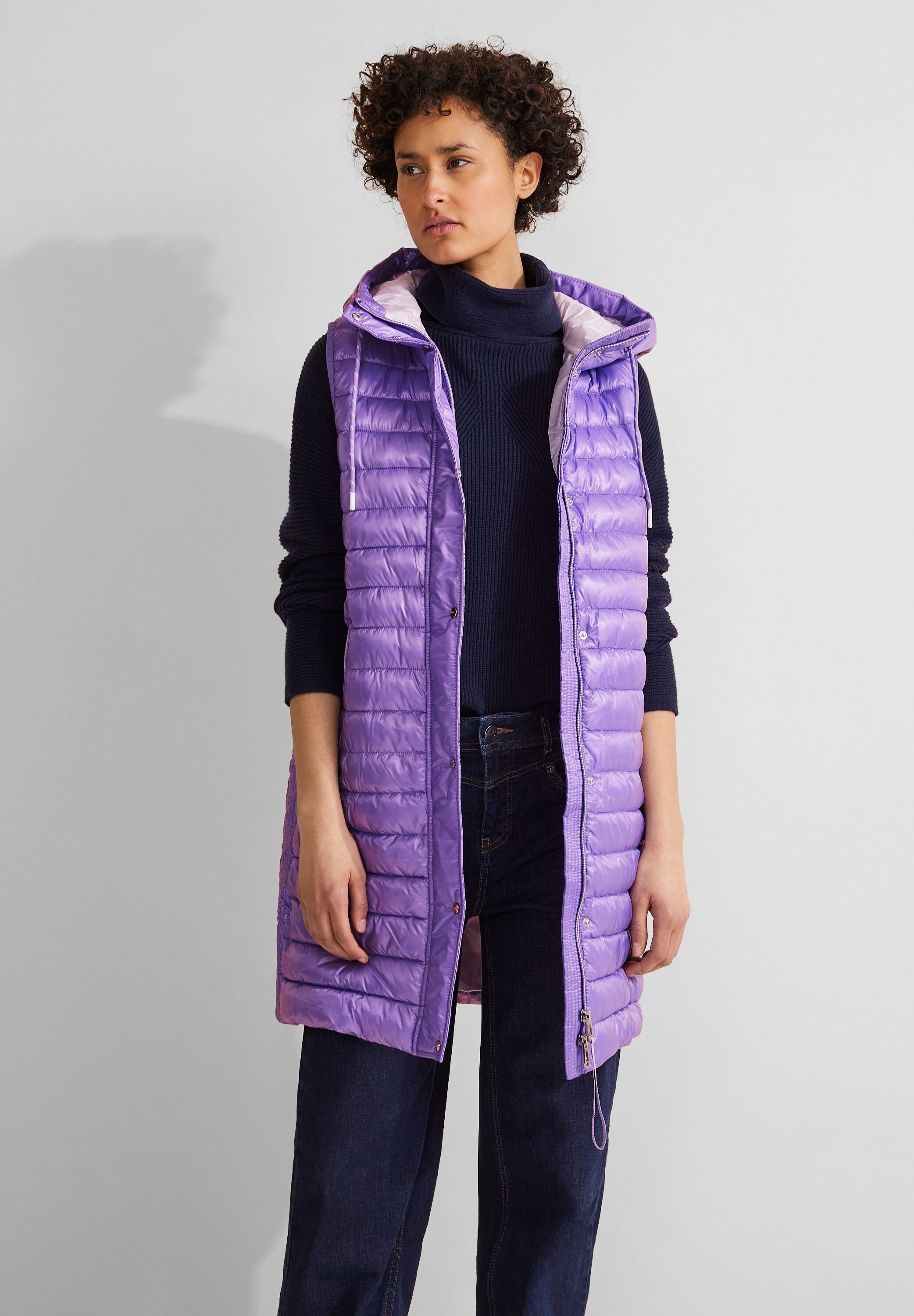 Street One Damen Steppweste, Übergang, Kapuze, Tunnelzugband, verdeckter Zipper, Long Form, Zippertaschen. Die lange Steppweste von Street One ist eine vielseitige Ergänzung für deine Garderobe. Sie verfügt über einen Tunnelzug in der Kapuze, einen verdeckten Reißverschluss und praktische verschließbare Taschen. Diese unifarbene Longweste schützt deinen Rücken und bietet dir verschiedene Kombinationsmöglichkeiten für deinen Alltag. Mit ihrem schlichten Design und der funktionalen Ausstattung ist sie ein praktisches und stilvolles Kleidungsstück für die Übergangszeit.