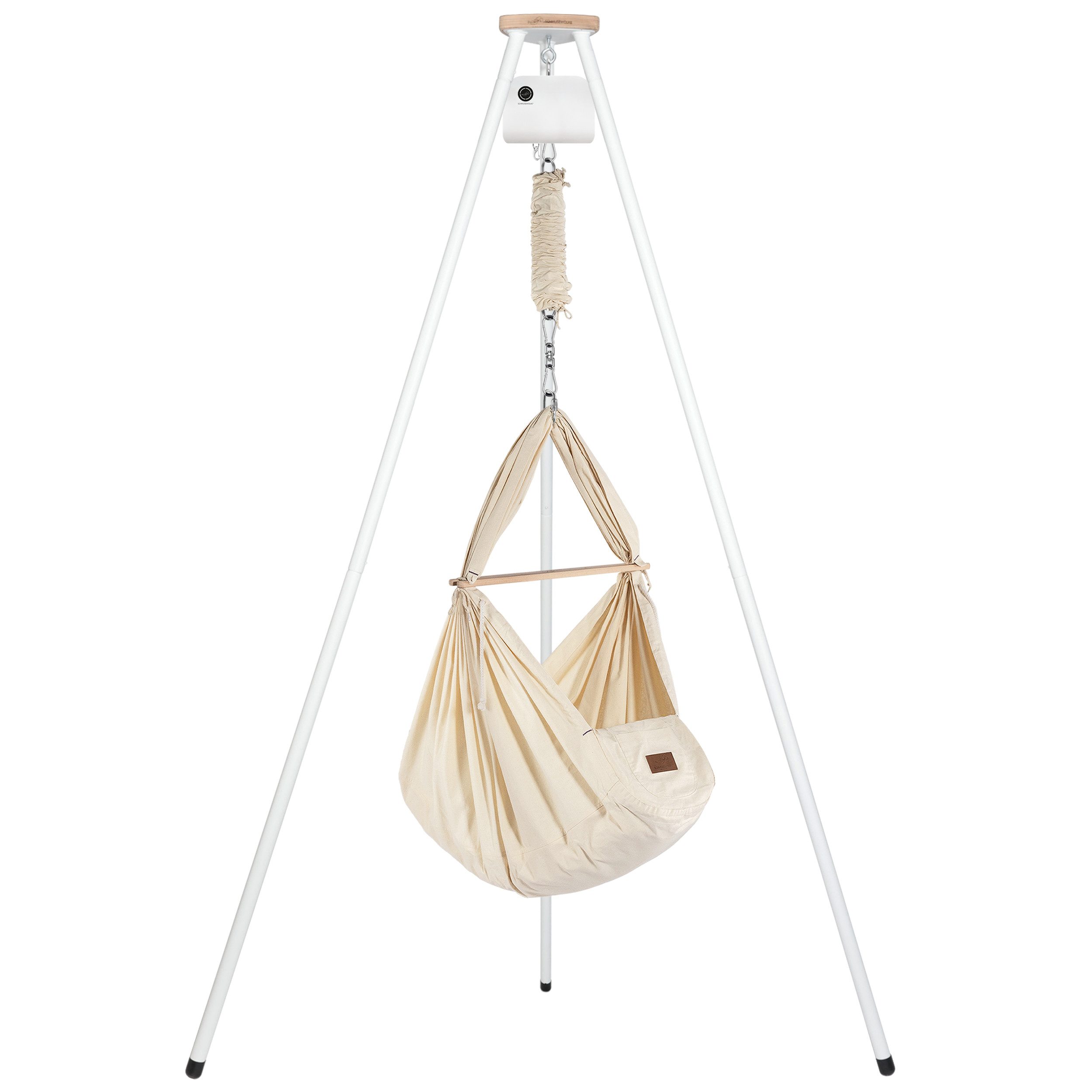Lieferumfang | 1 Wiegensack Babyhängematte, 1 Matratze Schafwolle, 1 Feder mit Sicherheitsseil, 1 Federüberzieher, 3 Deckenbefestigungssets (je 1 Dübel und 1 Ösenschraube), 1 Holz-Trennstab mit 2 Fixier-Bändern, 1 Trage- und Aufbewahrungstasche, 1 Verlängerungsband, 1 Drehwirbel, 1 Kettenschnellglied, 4 Karabinerhaken 1 TIPI Gestell für Federwiege 1 Federwiegen-Motor, 1 12V-Adapter mit 3 m Kabel, 2 Karabinerhaken, 3 Kabelklettband |