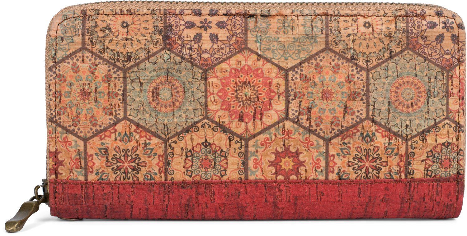 styleBREAKER Damen Geldbörse aus Kork mit buntem Ethno Muster Print, umlaufendem Reißverschluss.