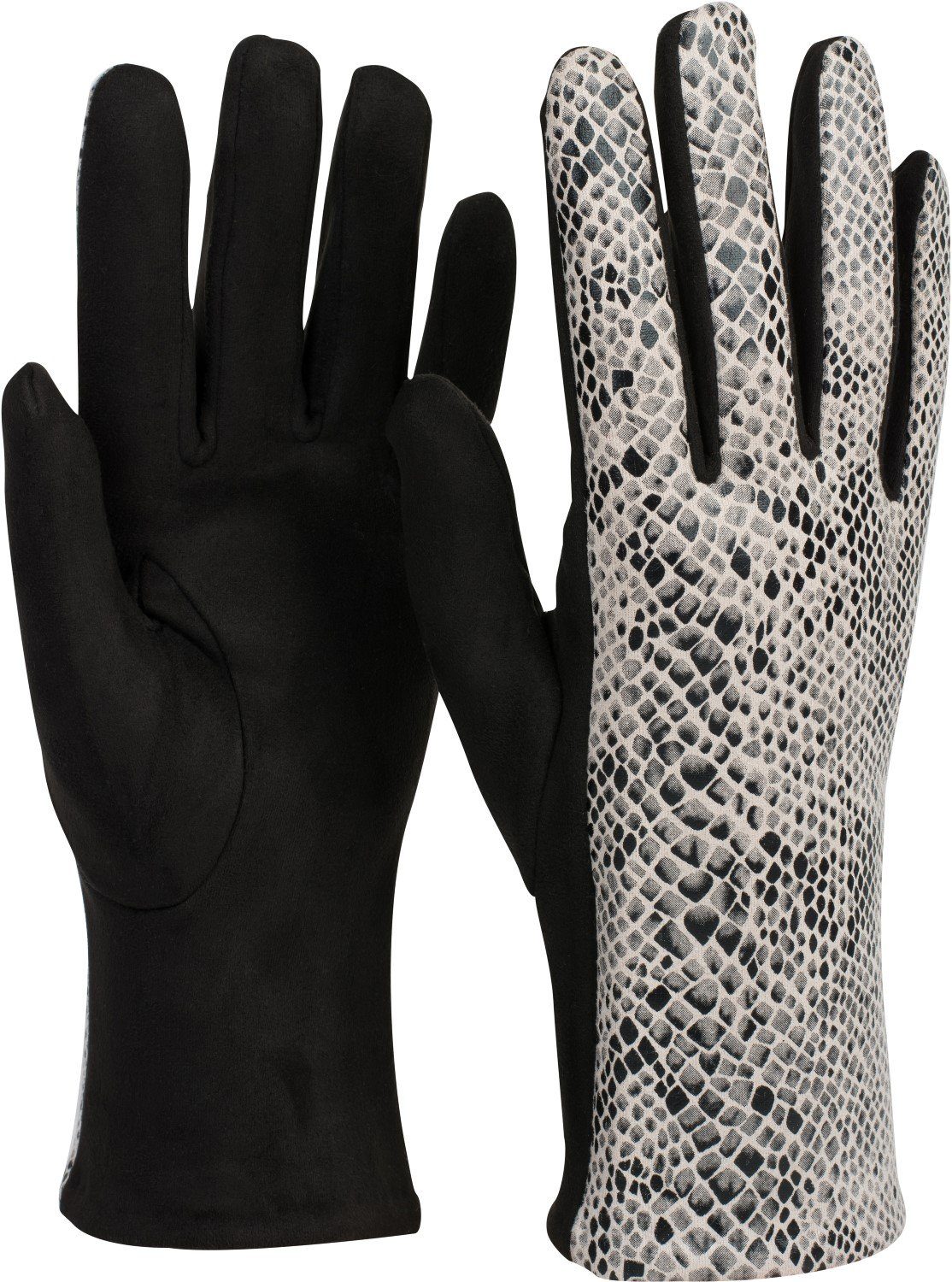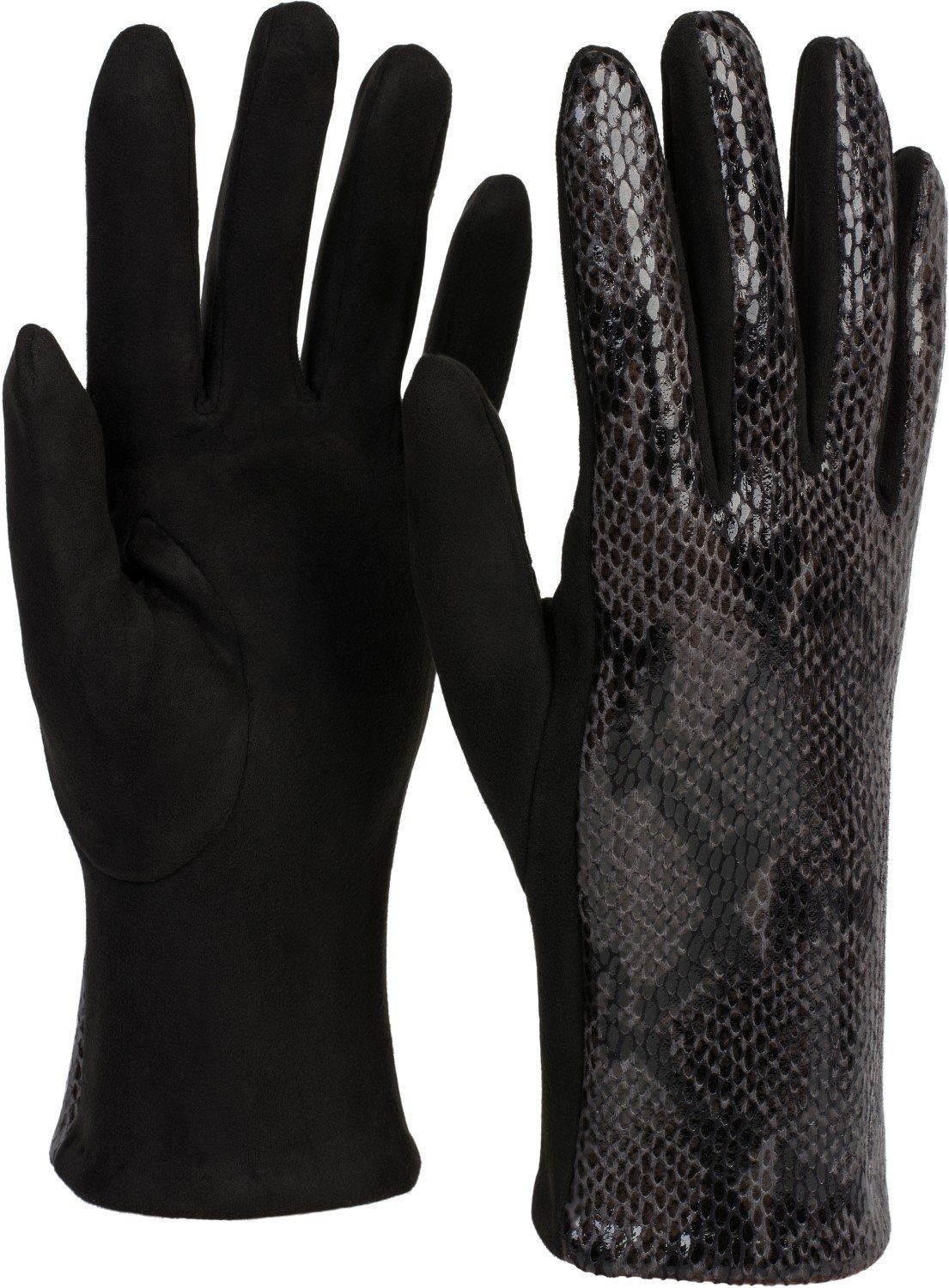 styleBREAKER edle warme Winter-Handschuhe aus Stoff mit Oberseite in glänzender Schlangenleder Optik.