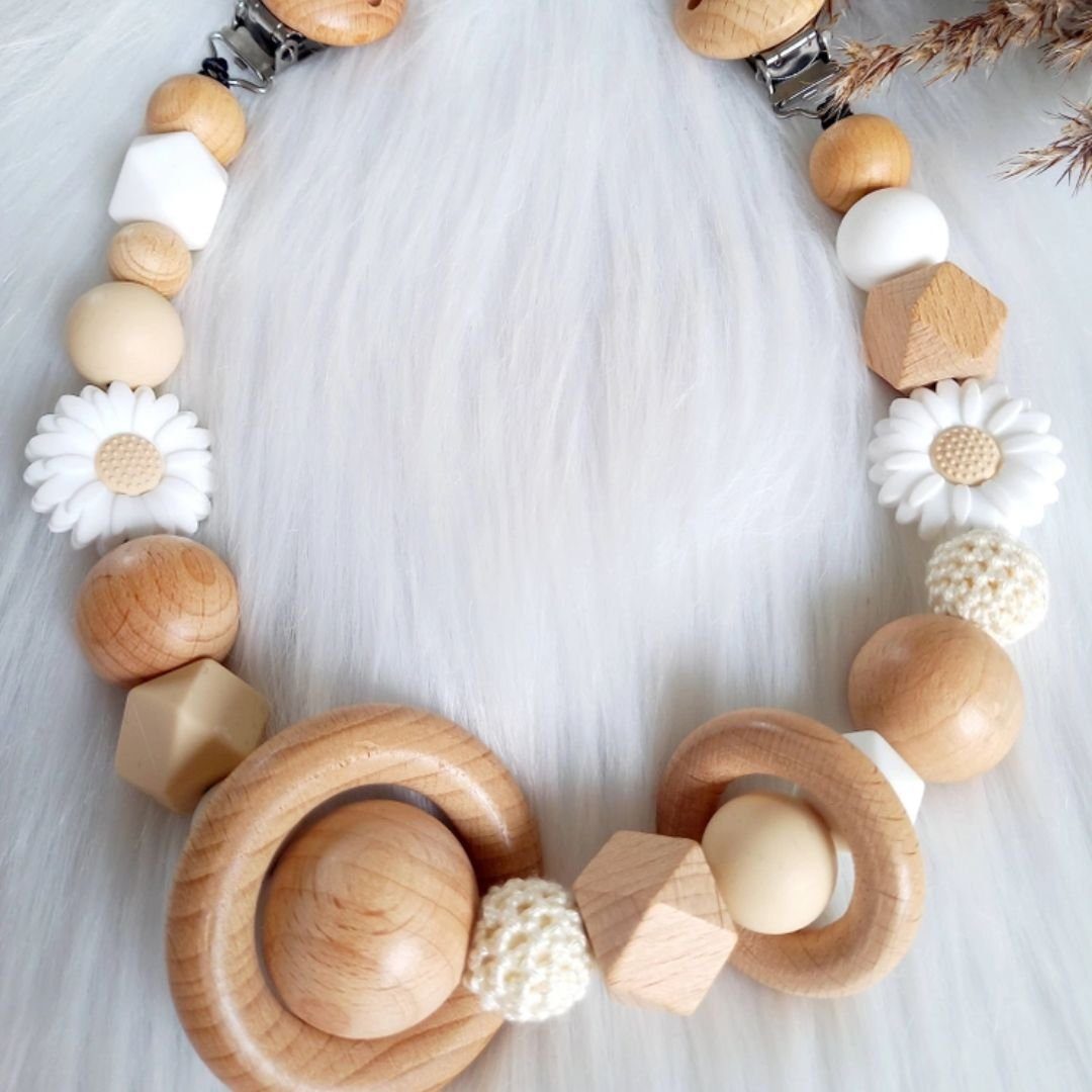 aus Naturholz mit Silikonperlen und gehäkelter Baumwolle
