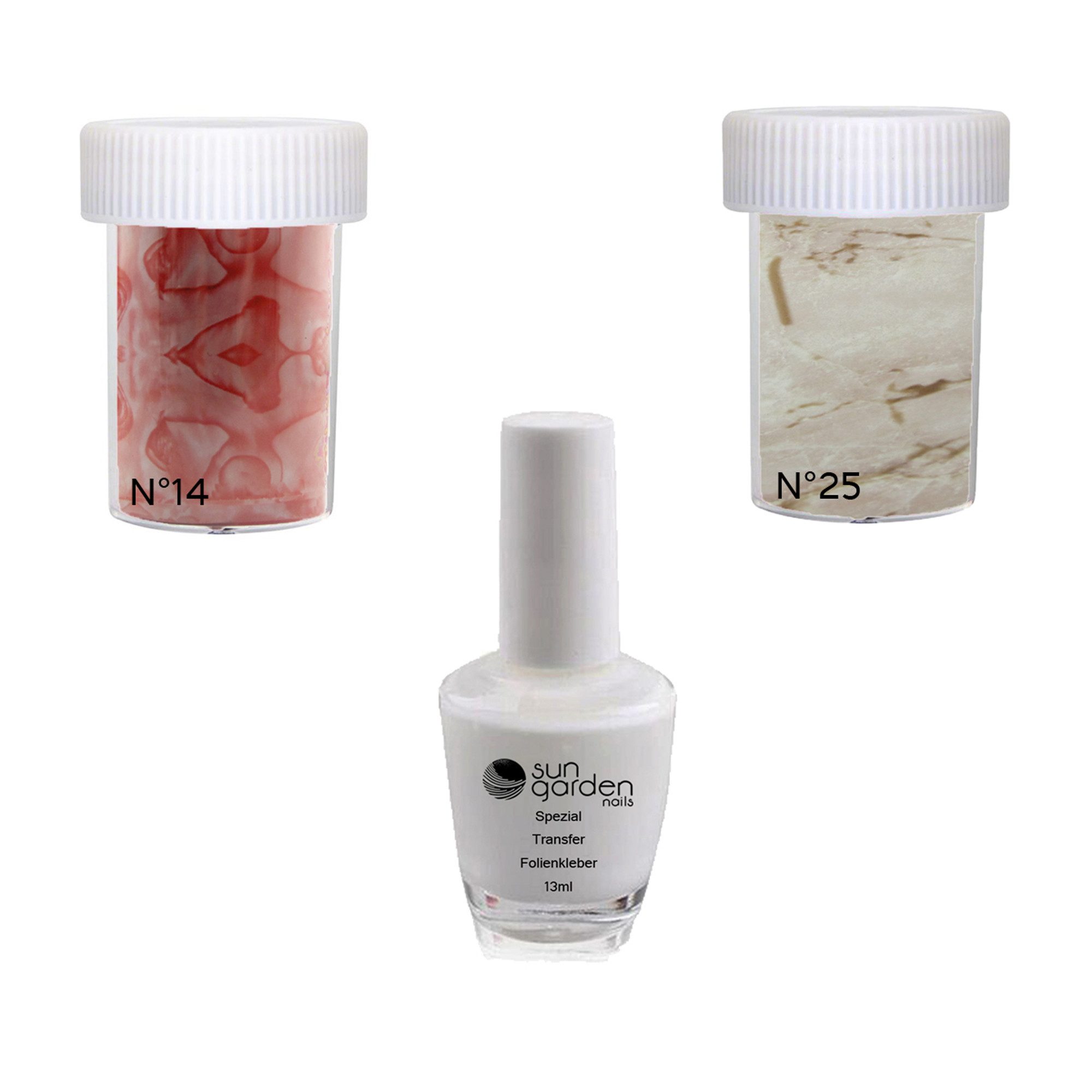 MARBLE SET 6 mit 2 eleganten Transferfolien & 13 ml Spezialkleber – ideal für dezente Fullcover, Frenchdesigns & edle Akzente auf Gel-, Acryl- und Naturnägeln.