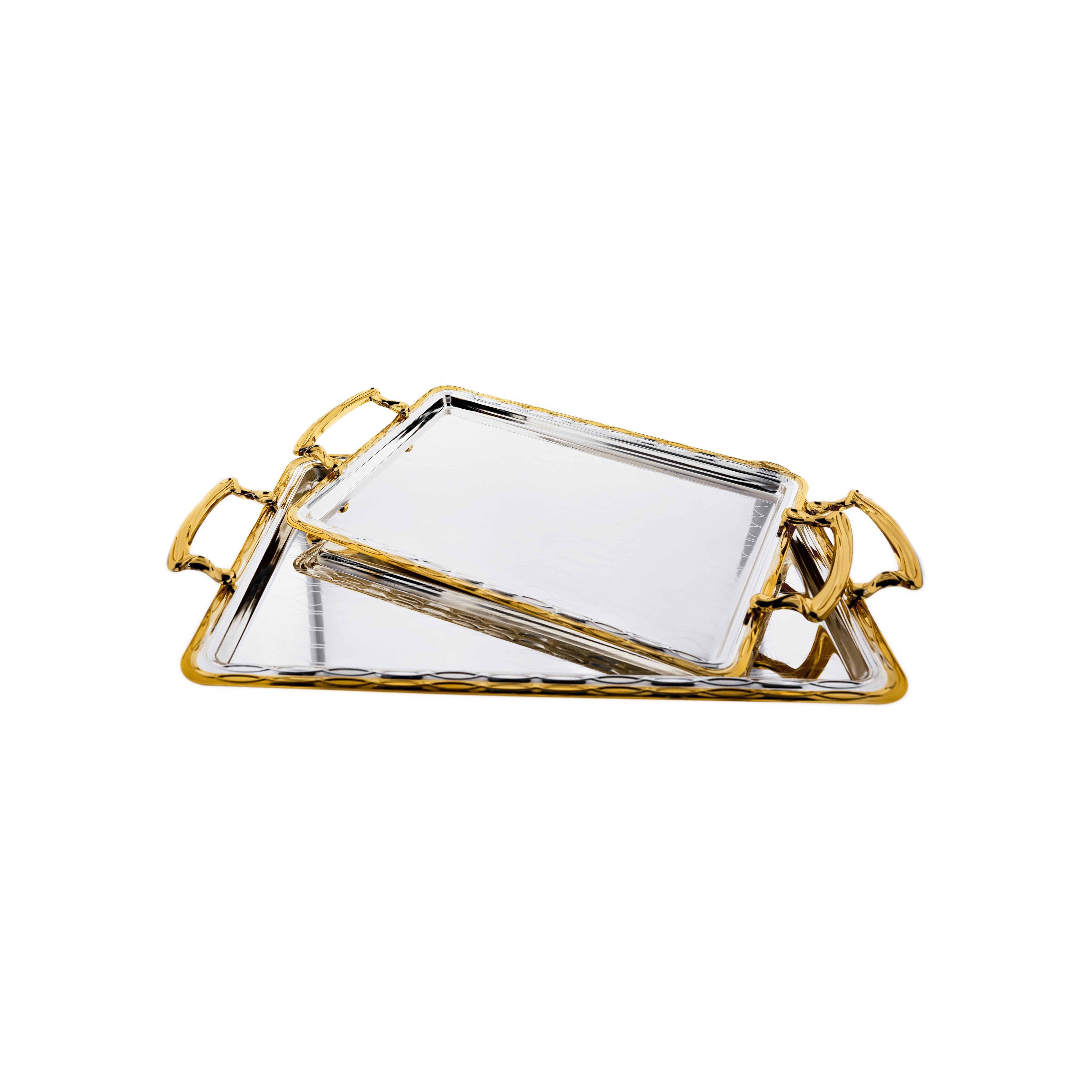 Dieses Serviertablett vereint Eleganz und Funktionalität in perfekter Harmonie. Gefertigt aus hochwertigem Edelstahl strahlt es Langlebigkeit und Stil aus. Das silberne Finish des Tabletts wird durch Muster akzentuiert, das ihm einen Hauch von Luxus verleiht. Das Edelstahlmaterial macht das Tablett leicht zu reinigen und pflegeleicht, sodass Sie es immer wieder verwenden können, ohne dass es an Glanz verliert. Das Design des Tabletts macht es zu einem vielseitigen Stück, das sowohl für den privaten Gebrauch als auch für Veranstaltungen und Feierlichkeiten geeignet ist.