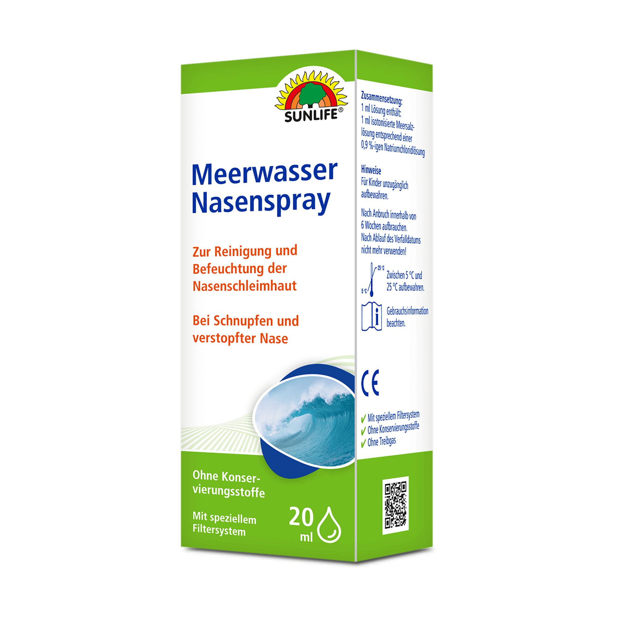 SUNLIFE® Meerwasser Nasenspray befeuchtet, reinigt und pflegt eine trockene und gereizte Nasenschleimhaut. Ebenso ist SUNLIFE® Meerwasser Nasenspray zur unterstützenden Therapie bei Schnupfen mit verstopfter Nase geeignet. Auch bei längerer Anwendung besteht kein Gewöhnungseffekt.