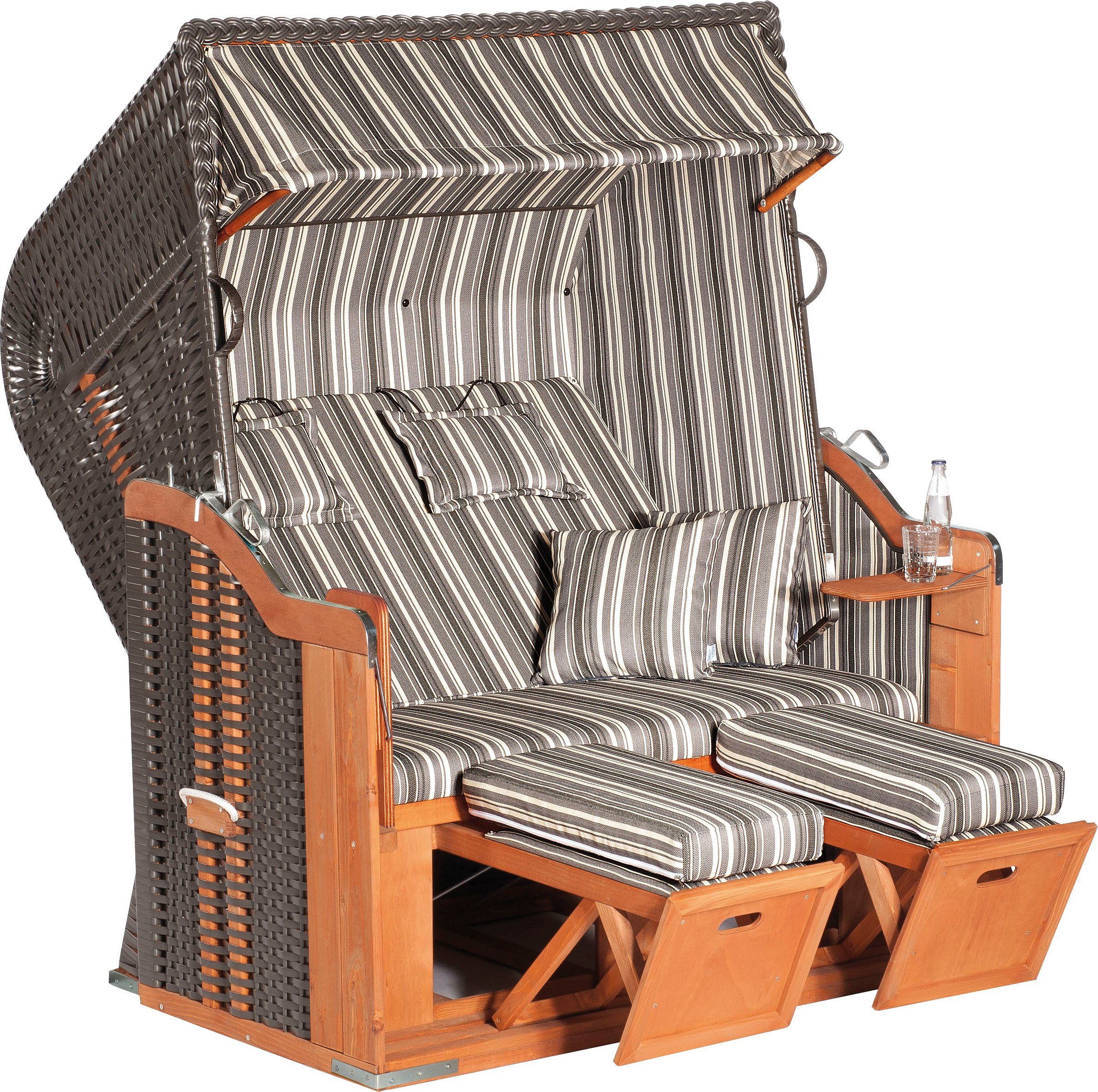 Tolle Optik toller Komfort: Der SUNNY SMART Strandkorb »Rustikal 250 Plus XL « mit einem Korpus aus nordischem Fichtenholz und einem modernen Kunststoffgeflecht macht auf der Terrasse oder im Garten ordentlich was her. Das Innere des Strandkorbs mit weicher Polsterung, zwei praktischen Klapptischen und zwei gemütlichen Kuschelkissen sorgt für viele Stunden höchster Gemütlichkeit – und ermöglicht entspannende Sonnenbäder auch bei einer steifen Brise.