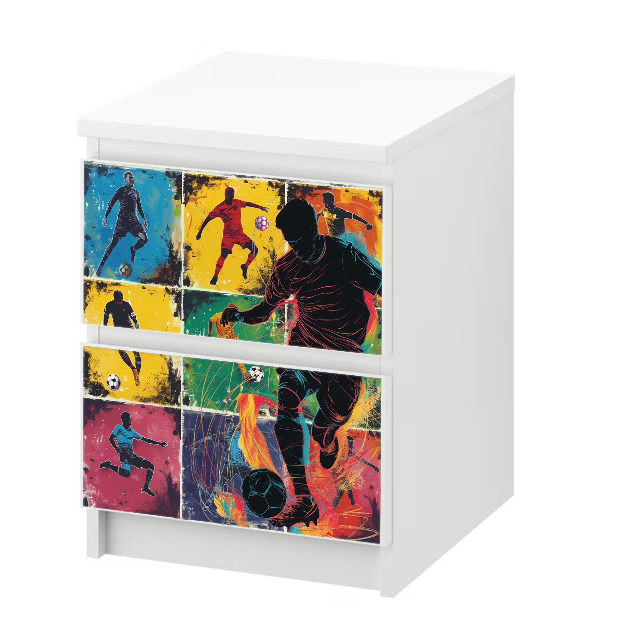 "Verleihen Sie Ihrer Malm Kommode mit unserer maßgeschneiderten Möbelfolie und Fussball Spieler Motiv einen frischen, stilvollen Look. Die exklusive Designfolie für Malm Schubladen ist die perfekte Wahl für eine schnelle und effektive Verschönerung Ihrer Möbel. Ob Sie die Atmosphäre Ihres Schlafzimmers aufwerten oder eine kreative Wickelauflage Malm Kommode für das Kinderzimmer gestalten möchten – unsere selbstklebende Folie bietet Ihnen endlose Möglichkeiten. Unsere hochwertige Dekorfolie für Malm Möbel ist speziell für die Maße der beliebten -Serie entworfen. Sie ermöglicht es Ihnen, im Handumdrehen aus einem gewöhnlichen Möbelstück ein individuelles Kunstwerk zu schaffen. Mit einer Auswahl an Farben und Mustern, die von schlicht und elegant bis hin zu fröhlich und kindgerecht für die Klebefolie Möbel Kinderzimmer reichen, können Sie Ihrer Malm Kommode einen persönlichen Touch verleihen. Die Malm Kommode Individualisierung war noch nie so einfach. Unsere Malm Designsticker sind für eine blasenfreie Anwendung konzipiert, dank der innovativen Luftkanaltechnologie, die eine glatte und professionelle Optik garantiert. Keine Falten, keine Luftblasen – nur ein makelloses Finish, das Ihre Malm Kommode zum Hingucker macht. Machen Sie aus Ihrer Malm Kommode ein Unikat und genießen Sie das neue Erscheinungsbild, das durch unsere Malm Spezialfolie ermöglicht wird. Geeignet für - Malm 6 Schubladen ≈ 80 cm. Perfekte Schubladenfolie für Malm die Ihren Wohnraum perfekt ergänzt. Mit der Malm Schrank Verschönerung von Sunnywall Manufaktur aus Berlin setzen Sie auf Qualität und Design, die Hand in Hand gehen. Mit nur wenigen Handgriffen verwandelt unsere Möbelfolie Ihre Malm Kommode und verleiht jedem Raum einen Hauch von Eleganz und Persönlichkeit. Entdecken Sie die einfache Art der Möbeltransformation und erfreuen Sie sich an einem Zuhause, das Ihre eigene Designvision widerspiegelt."