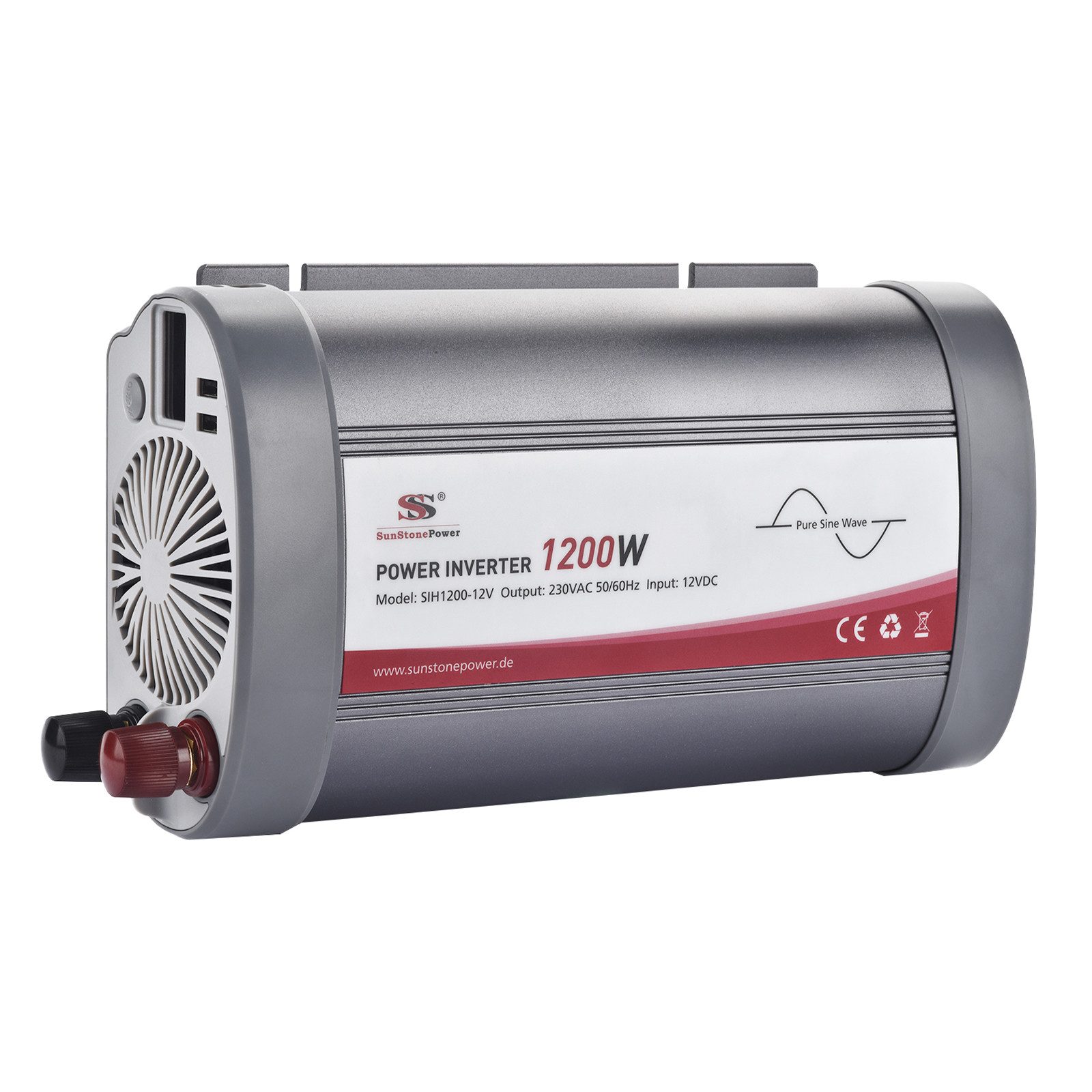 SIH1200-12V ist ein Wechselrichter mit reinem Sinuswellenausgang, der an eine 12V LiFePO4 Batterie oder eine Blei-Säure-Batterie angeschlossen werden kann. Zu den Ausgängen gehören zwei Wechselstromsteckdosen, zwei USB-Anschlüsse und ein Typ-C-Schnellladeanschluss.