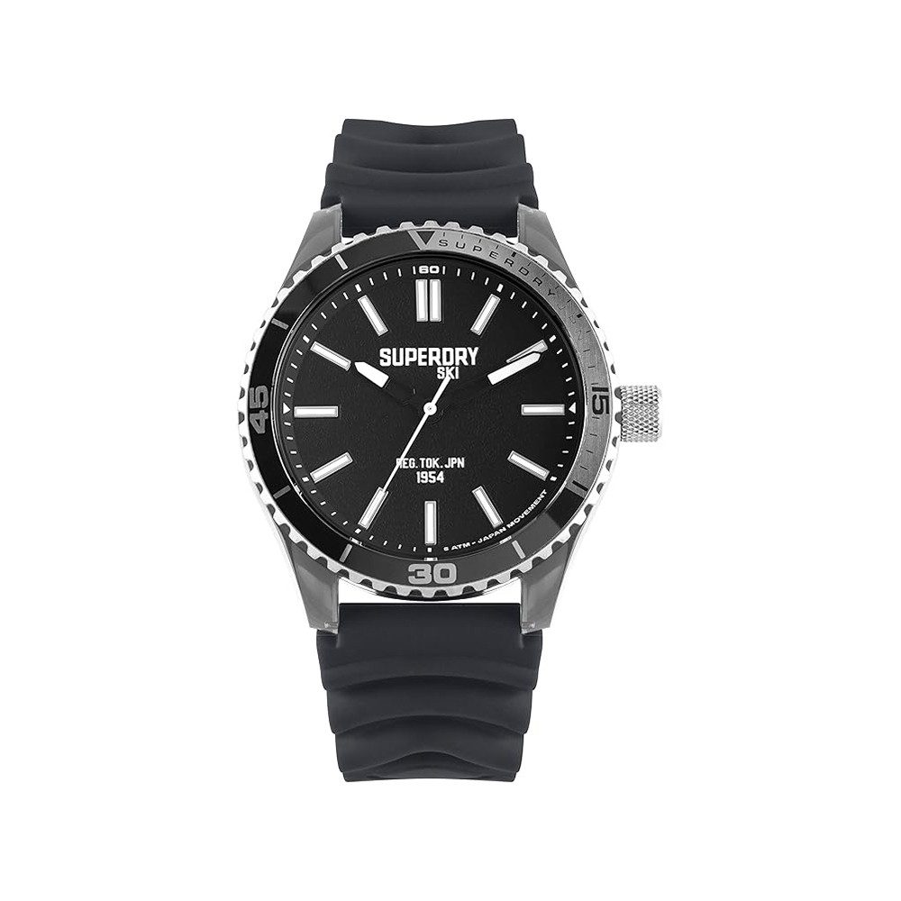 Die Superdry Tokyo Ski Black Bronze (Artikelnummer: SYG241E) ist eine sportlich-dynamische Uhr, die durch ihr markantes Design und ihre hochwertige Verarbeitung überzeugt. Mit einem extra großen Gehäusedurchmesser von 47 mm aus grauem Kunststoff und einem schwarzen Silikonarmband ist sie sowohl robust als auch modern. Das schwarze Ziffernblatt mit weißen Indizes verleiht der Uhr einen zeitlosen, klaren Look, der sich perfekt für den Alltag und sportliche Aktivitäten eignet.