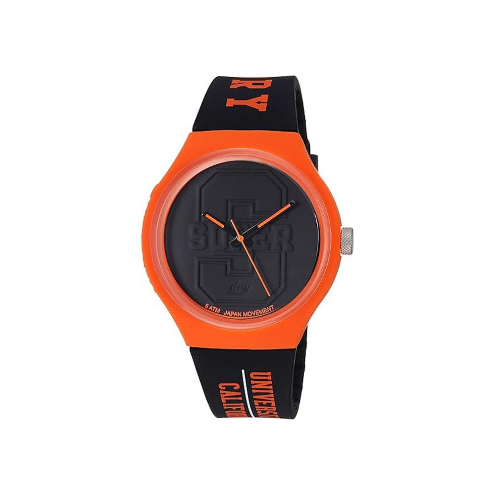 Die Superdry Urban XL Varsity (Artikelnummer: SYG240BO) ist eine stilvolle Uhr, die sportliches Design mit Funktionalität verbindet. Ihr rundes Gehäuse aus orangefarbenem Kunststoff und das elegante schwarze Ziffernblatt mit orangefarbenen Akzenten verleihen dieser Uhr einen einzigartigen Look. Das schwarze Silikonarmband, bedruckt mit den Schriftzügen "University of California" und "Superdry" in Orange, sorgt für einen besonderen Eyecatcher. Dank ihrer Wasserdichtigkeit von 5 bar ist die Superdry Urban XL Varsity der perfekte Begleiter für jeden Tag.
