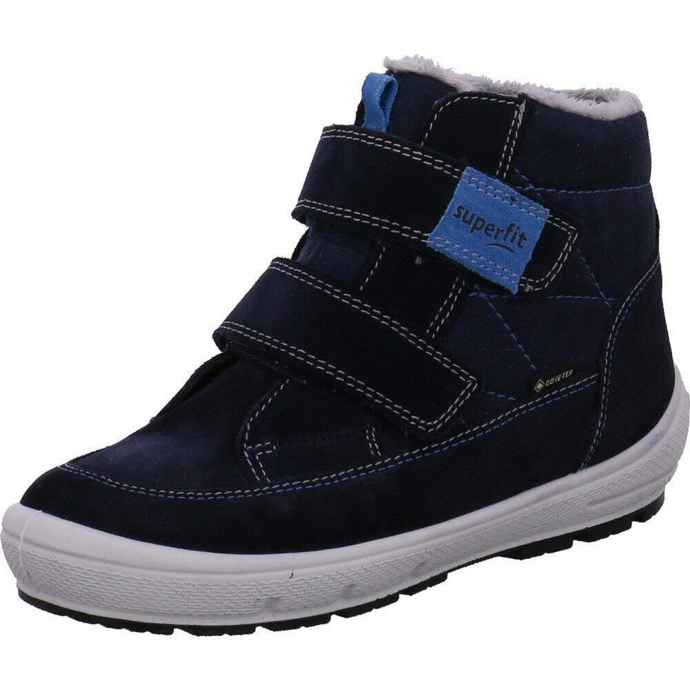 Dieser halbhohe Kinder Winterstiefel Groovy von Superfit überzeugt in Blau Grün und lässt jedes Jungenherz höher schlagen. Das weiche Veloursleder und das trendige Design machen diesen Schuh zu einem Must Have. Zudem sorgt das weiche textile Innenfutter stets für mollig warme Füße. Die integrierte Gore Tex Membran macht den Schuh zudem wasserdicht und winddicht und dennoch atmungsaktiv. Damit die Membran auch wirklich für trockene Füße sorgt, achten Sie bitte auf die richtige Auswahl der Socken, diese sollten nicht aus reiner Baumwolle bestehen. Beim Tragen reiner Baumwollsocken kann Ihr Kind nämlich trotzdem nasse Füße bekommen, allerdings nicht vom Regen oder Schnee, sondern vom Tropenklima in den Schuhen. Der angenehm breite Vorderschuh sorgt für genügend Zehenfreiheit und die bequeme Innensohle für absoluten Komfort. Durch den doppelten Klettverschluss kann der Schuh den Kinderfüßen optimal angepasst werden.