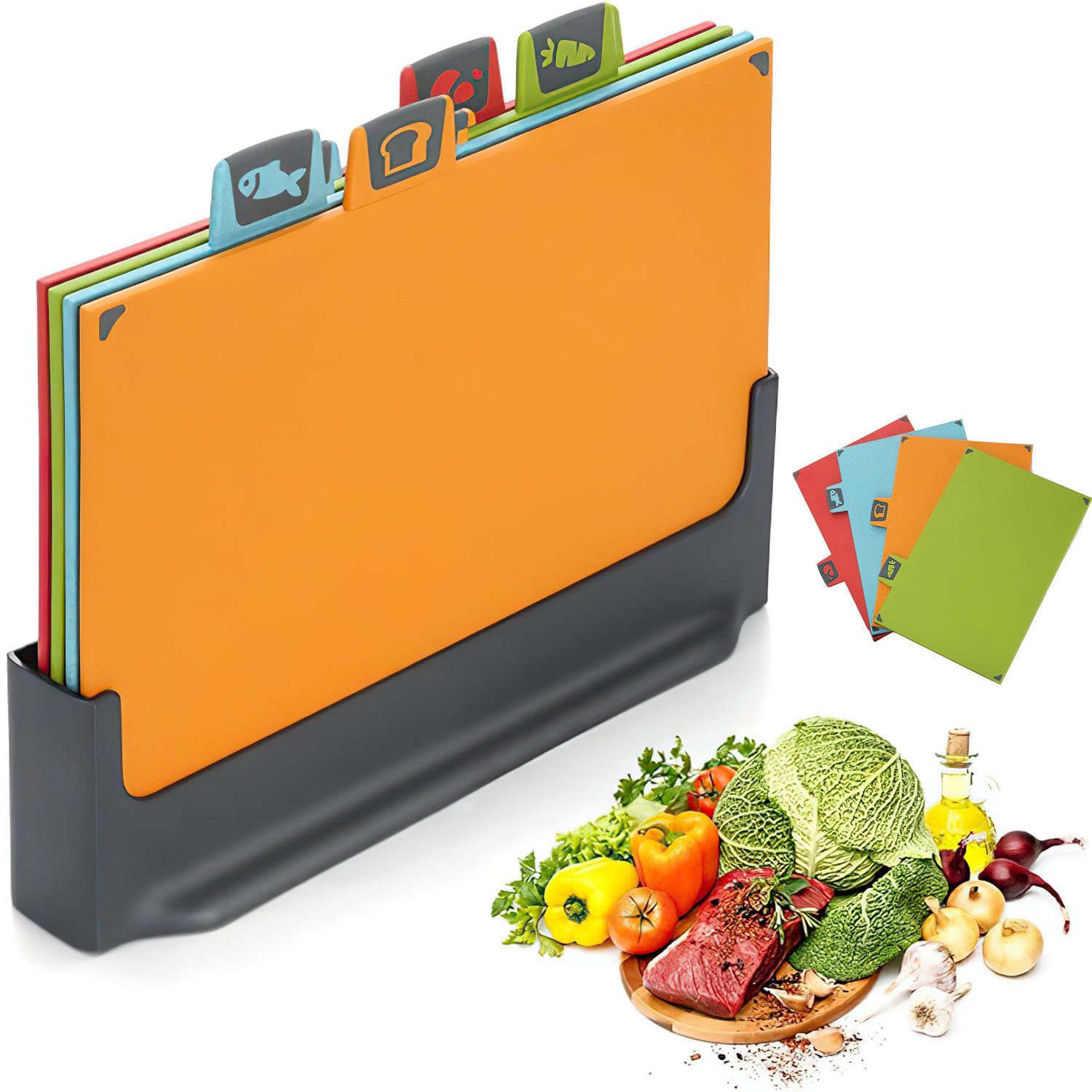 Küche Essentials Set Um verwirrung bei der verwendung von schneidebrett vermeiden, haben wir 4 farbcodierte schneidebretter entworfen. Sie können für verarbeitung von gemüse, meeresfrüchten, rohem fleisch und gekochten Lebensmitteln verwendet werden. Außerdem helfen die markierungen und farben auf den hackbrett dabei, rohe und gekochte lebensmittel auf hygiene und gesunde weise. schneidbrett kann zum Gebrauch umgedreht werden, so dass sich Aromen der Lebensmittel nicht gegenseitig stören.
