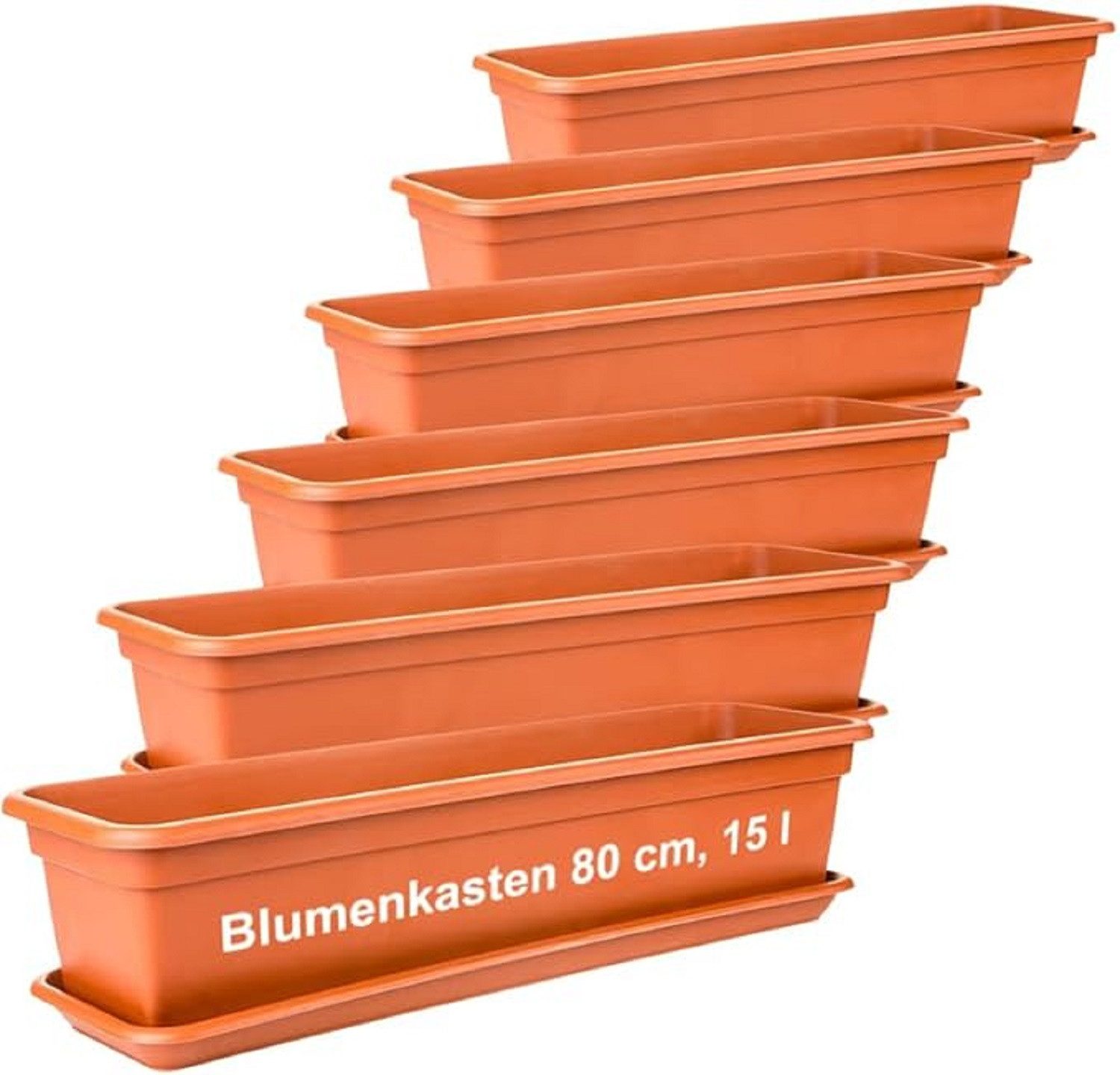 6 Blumenkästen 80x14x17 cm, 6 Untersetzer, Terracotta