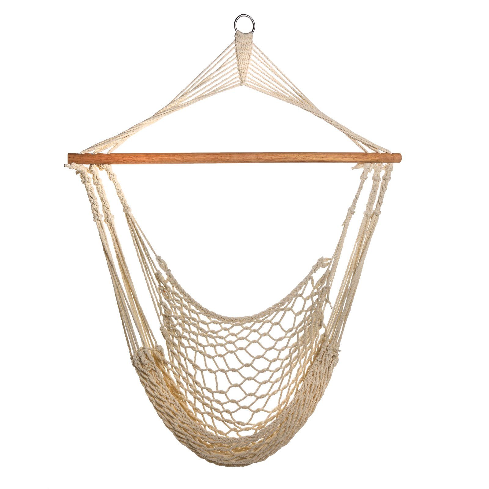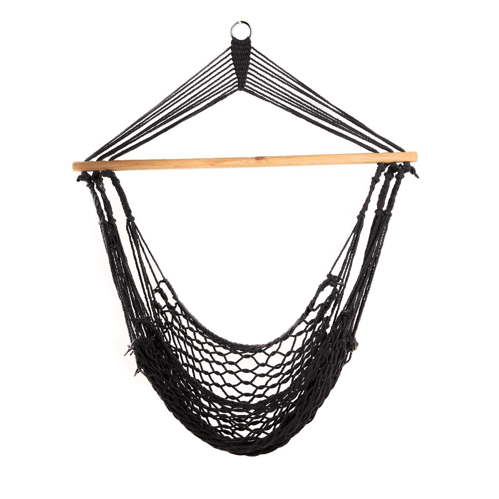 Zur einfachen Anbringung verfügt die Sitzhängematte über eine Querstrebe aus Holz und eine Öse, mithilfe welcher der Hängesitz an einem Gestell oder der Decke befestigt werden kann. (Befestigungsmaterial nicht im Lieferumfang enthalten!)