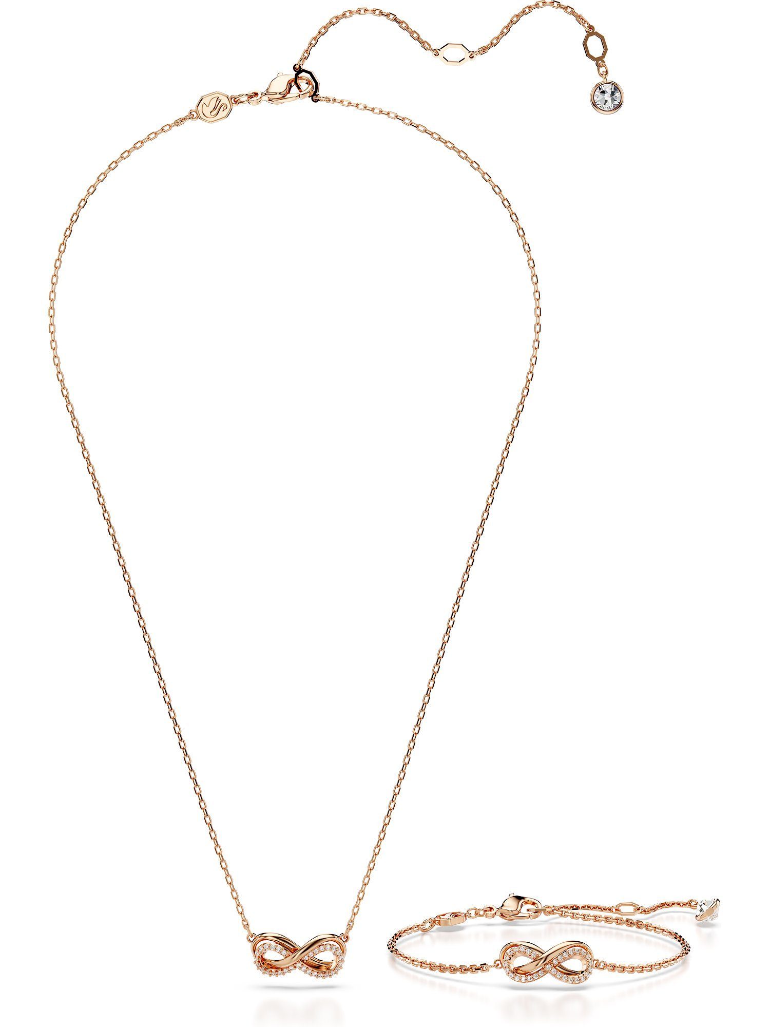Unendlich schön ist das roségoldfarbene Schmuck-Set Hyperbola aus Metall von Swarovski, bestehend aus einer Halskette und einem passenden Armband. Im Fokus des Designs steht das Unendlichkeitszeichen, welches sowohl an der Kette als auch am Armband alle Blicke auf sich zieht. Eine roségoldglänzende Version ist jeweils in ein mit funkelnden, weißen Swarovski-Steinen besetztes Unendlichkeitszeichen verschlungen. Sowohl die Halskette als auch das Armband lassen sich dank Zwischenösen in drei verschiedenen Длинаn tragen. Mit diesem Set verleihst du all deinen Outfit im Handumdrehen einen Hauch von Luxus!