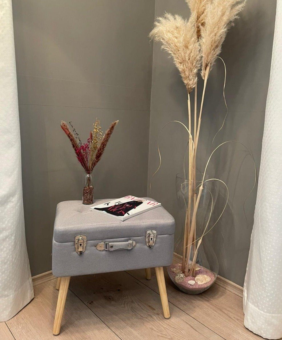 Hocker im Kofferdesign Hocker- mit integriertem Staufach, Kommode, Nachttisch, Truhe, Polsterhocker Farbe: grau Stoffbezug / Holzbeine Natur Happy Home Company präsentiert seine neue Hockerkollektion. Die edel verarbeiteten Hocker aus Stoff/Baumwolle, bieten neben einem einzigartig modernen Äußeren, ausreichend Stauraum für jegliche Utensilien wie beispielsweise Muetzen, Schals etc. Die Hocker sind mit einem pflegeleichten Stoff ueberzogen, welcher leicht abgewaschen werden kann. Happy Home Company folgt hiermit den neuesten Einrichtungstrends. Die Happy Hocker verleihen ihrem Zuhause einen gewissen Retro-Chic. Die Beine bestehen aus lackiertem Holz in natur und sind leicht einzudrehen. Sie benoetigen keinerlei Werkzeug- lediglich 5 Minuten Montagezeit. Die Sitzflaeche des Hockers ist bequem gepolstert. Sie dient somit also als bequeme Sitzmoeglichkeit. Die Maße des Hockers: 50cm x35cm x45 cm. *Dekoration ist im Lieferumfang nicht inbegriffen.