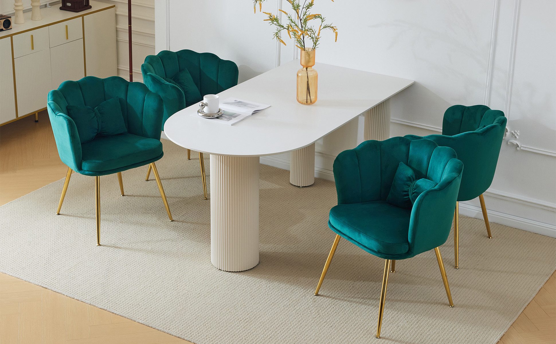 Set mit 4 modernen Samt-Wohnzimmerstühlen, Badezimmerstühlen, gepolsterten Stühlen mit Blütenblatt-Rücken, vergoldeten Metallbeinen und Schmetterlingskissen für das Schlafzimmer-Esszimmer