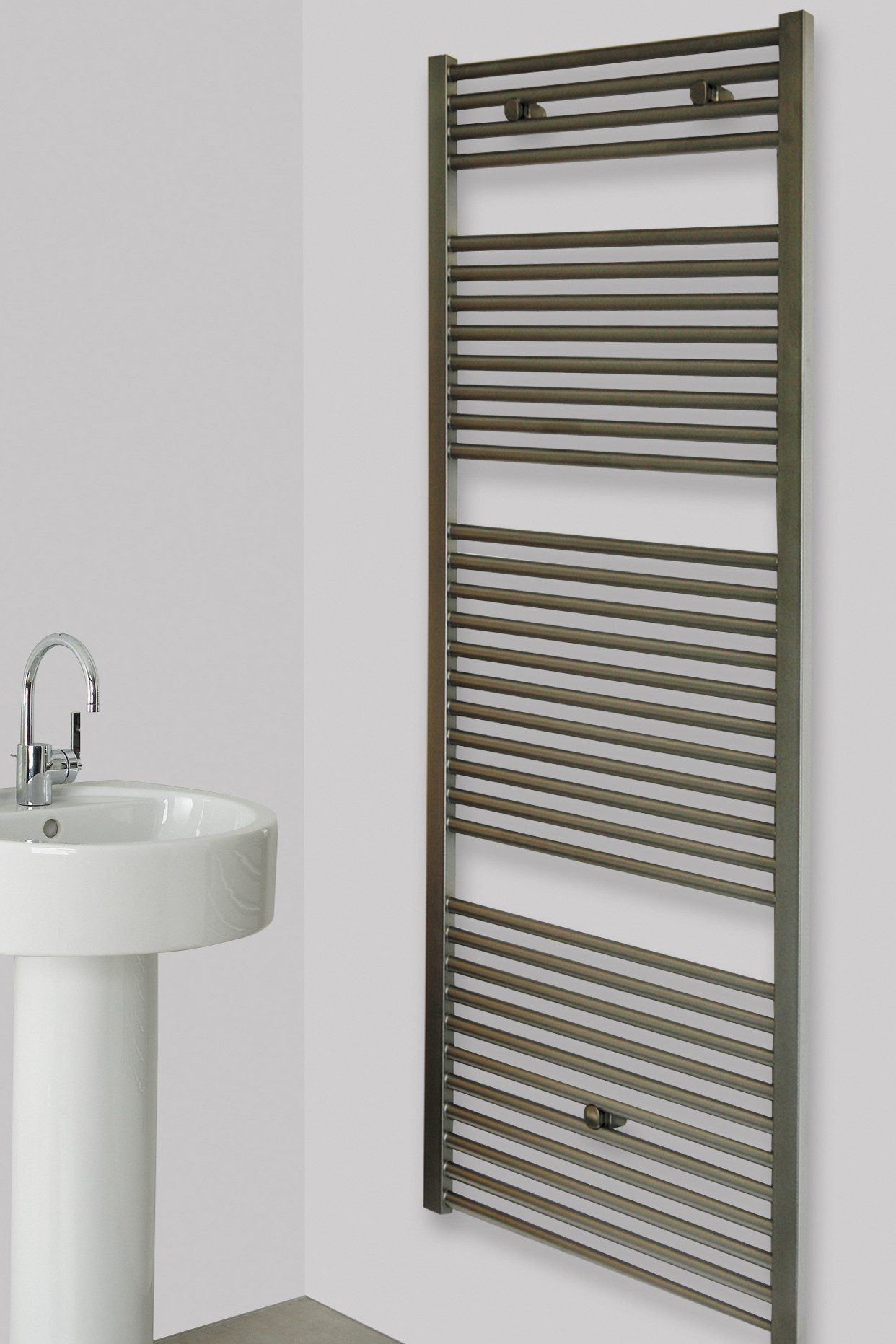 Qualitativ sehr hochwertiger Badheizkörper komplett aus Edelstahl mit exzellenten Schweißnähten. Eine extrem hohe Lebensdauer wird durch die Verwendung von rostfreiem Edelstahl der Güte 4301 erreicht. Dieser Badheizkörper ist ein echter Blickfang für jeden Wohnraum. Die Edelstahl-Oberfläche wurde mit einem speziellen Verfahren (Glasperlenbestrahlung) behandelt, so dass Sie nahezu unempfindlich gegen Fingerabdrücke ist. Die Oberfläche ist durch die Behandlung matt und erheblich unempfindlicher gegenüber den bekannten Dunstabzugshauben aus mattiertem (gebürsteten) Edelstahl. Geeignet zum Anschluss an die Heizungsanlage oder auch mit Heizstab für den Anschluss an das Stromnetz.