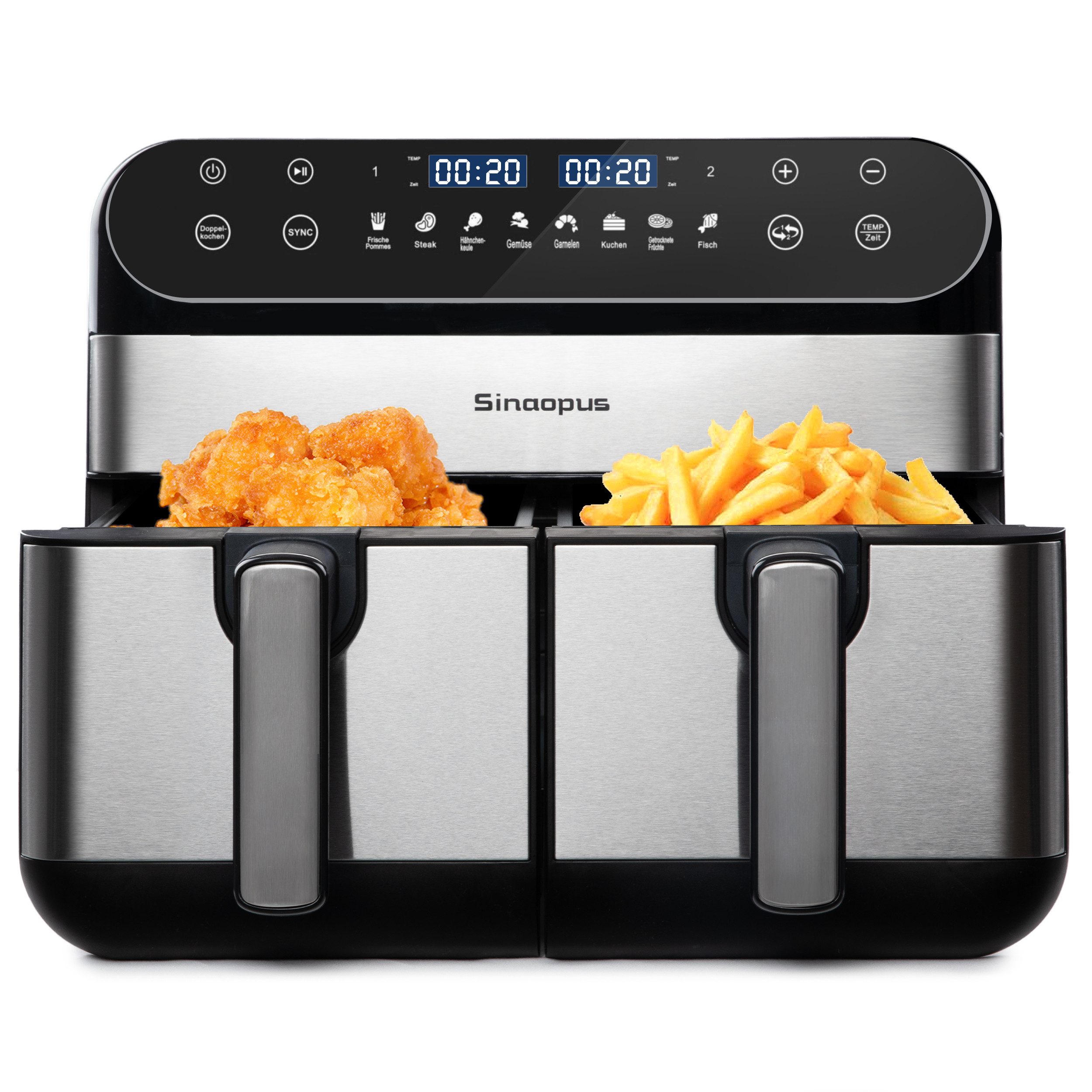 Die SYNC-Funktion sorgt dafür, dass beide Körbe trotz unterschiedlicher Einstellungen gleichzeitig fertig werden – perfekt für geplante Mahlzeiten.