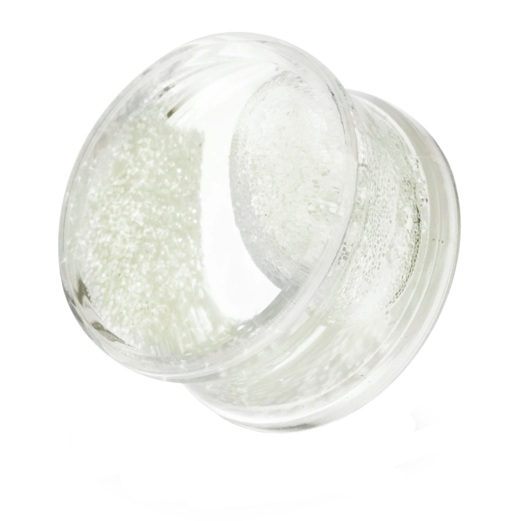 Dieser transparente Acryl Kunststoff Plug mit Flüssigkeit hat eine leicht nach außen gewölbte Vorderseite. Sein Inneres ist gefüllt mit Flüssigkeit die im Dunkeln leuchtet. Durch die Double Flared Form sitzt er sicher im Ohrläppchen.