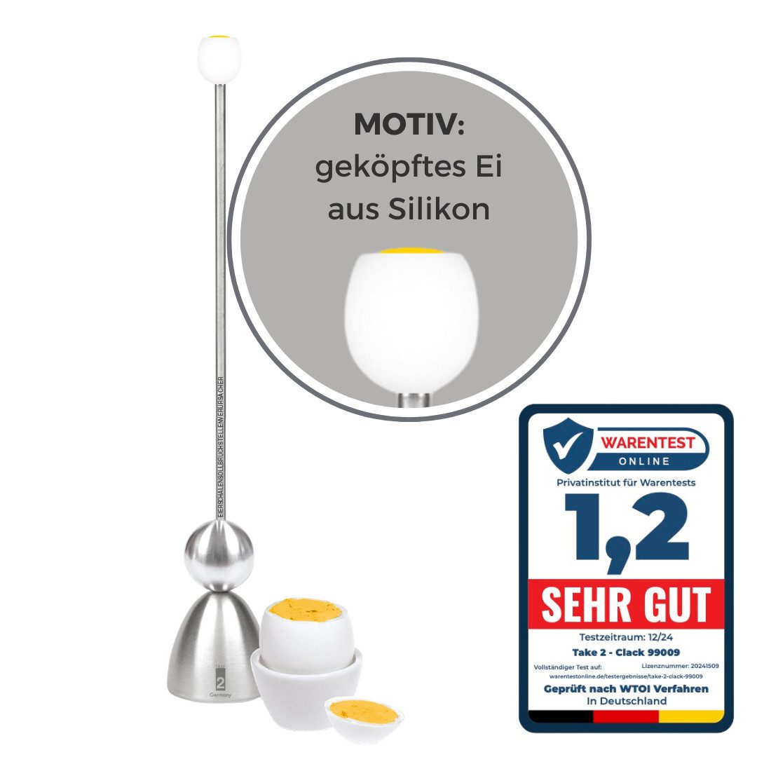 Der Eierschalensollbruchstellenverursacher – Sonderedition "Frühstücksei" ist das ultimative Werkzeug für Perfektionisten am Frühstückstisch. Mit seiner innovativen Technik sorgt er für den perfekten Bruch der Eierschale, ohne lästiges Krümeln oder unansehnliche Risse. Einfach Metallkappe auf das Ei setzen, die Schlagkugel hochziehen und fallen lassen – schon wird die Schale präzise und sauber abgetrennt.