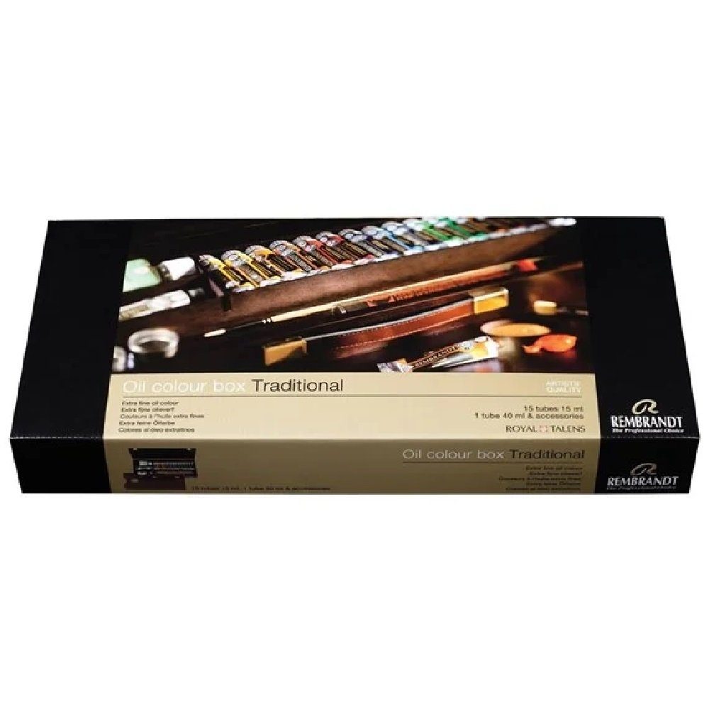 Die professionelle Rembrandt-Ölfarbe ist eine qualitativ hochwertige Farbe, die in den Niederlanden ausschließlich aus besten Rohstoffen hergestellt wird. Das Меню umfasst brillante, intensive Farben in sämtlichen Deckungsstufen. Die hohe Konzentration fein gemahlener Pigmente sorgt für eine optimale Farbstärke. Die Farben verfügen über ein Höchstmaß an Lichtechtheit, und die Farbschicht bietet eine hervorragende Widerstandsfähigkeit. Dieses traditionelle Holzkasten-Set enthält: (15) 15 ml-Tuben: Permanent-Zitronengelb (254), Permanentgelb mittel (284), Permanentgelb dunkel (285), Zinnoberrot (311), Permanentkrapp dunkel (342), Permanentrot mittel (377), Ultramarin dunkel (506), Königsblau (517), Phthaloblaugrün (576), Permanentgrün hell (618), Smaragdgrün (615), Ockergelb (227), gebrannte Siena (411), gebrannte Umbra (409), Oxidschwarz (735) und (1) 40 ml-Tube: Titanweiß (105). Dieses Set enthält außerdem 3 Kohlestifte, 2 Pinsel aus Schweineborste (Rundgröße 4, Filbertgröße 10), 75 ml Talens Malmittel, eine Holzpalette und einen doppelten Palettenstecker.