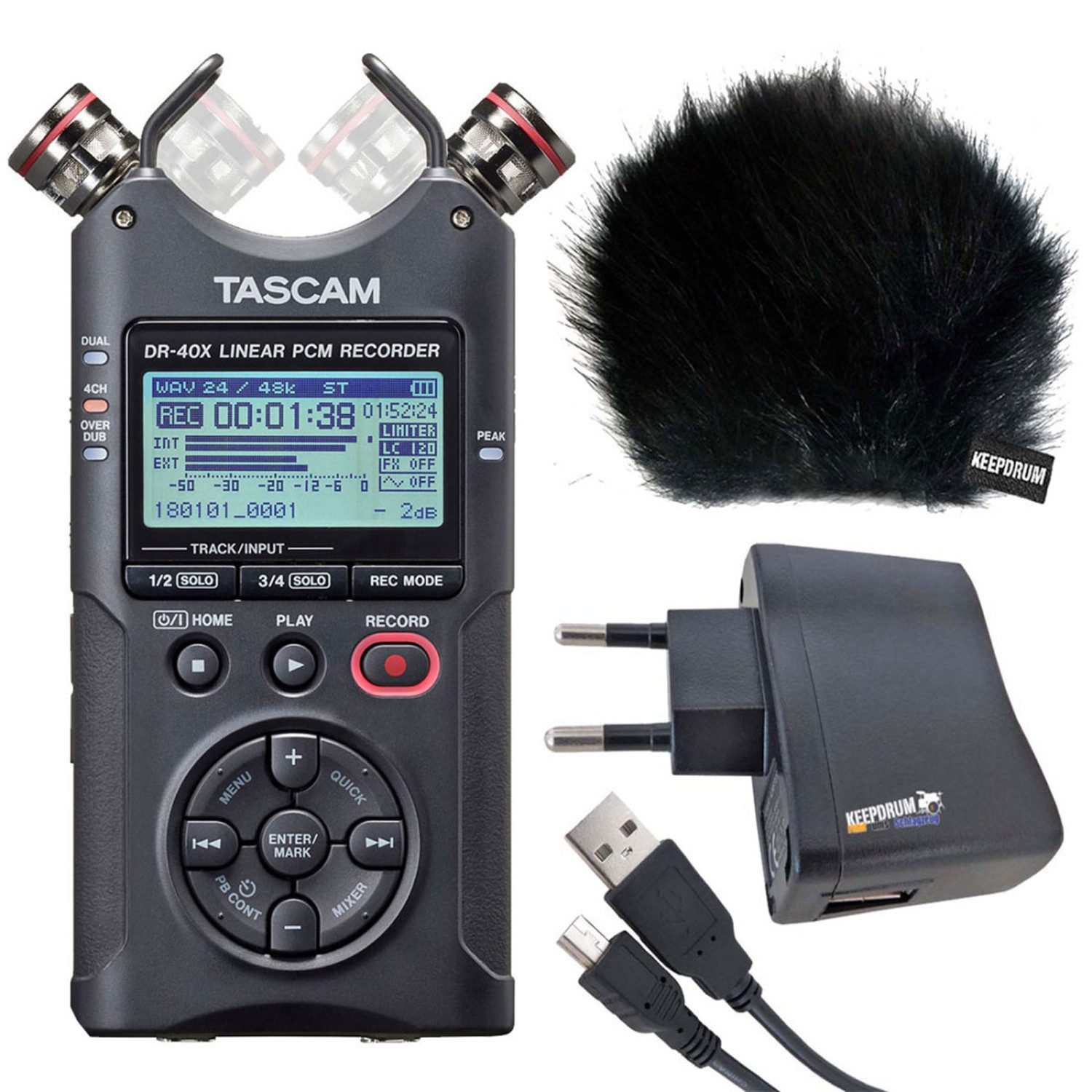 Die zwei verstellbarenKondensatormikrofone vertragen hohe Schalldruckpegel,womit der DR40X sich auch für laute Konzerte oder Proberaum-Aufnahmennutzen lässt. Mit den eingebauten Stereo-Mikrofonen können die Geräuschedes Publikums aufgezeichnet werden und zugleich die Performance derMusiker direkt aus dem Mischpult.
