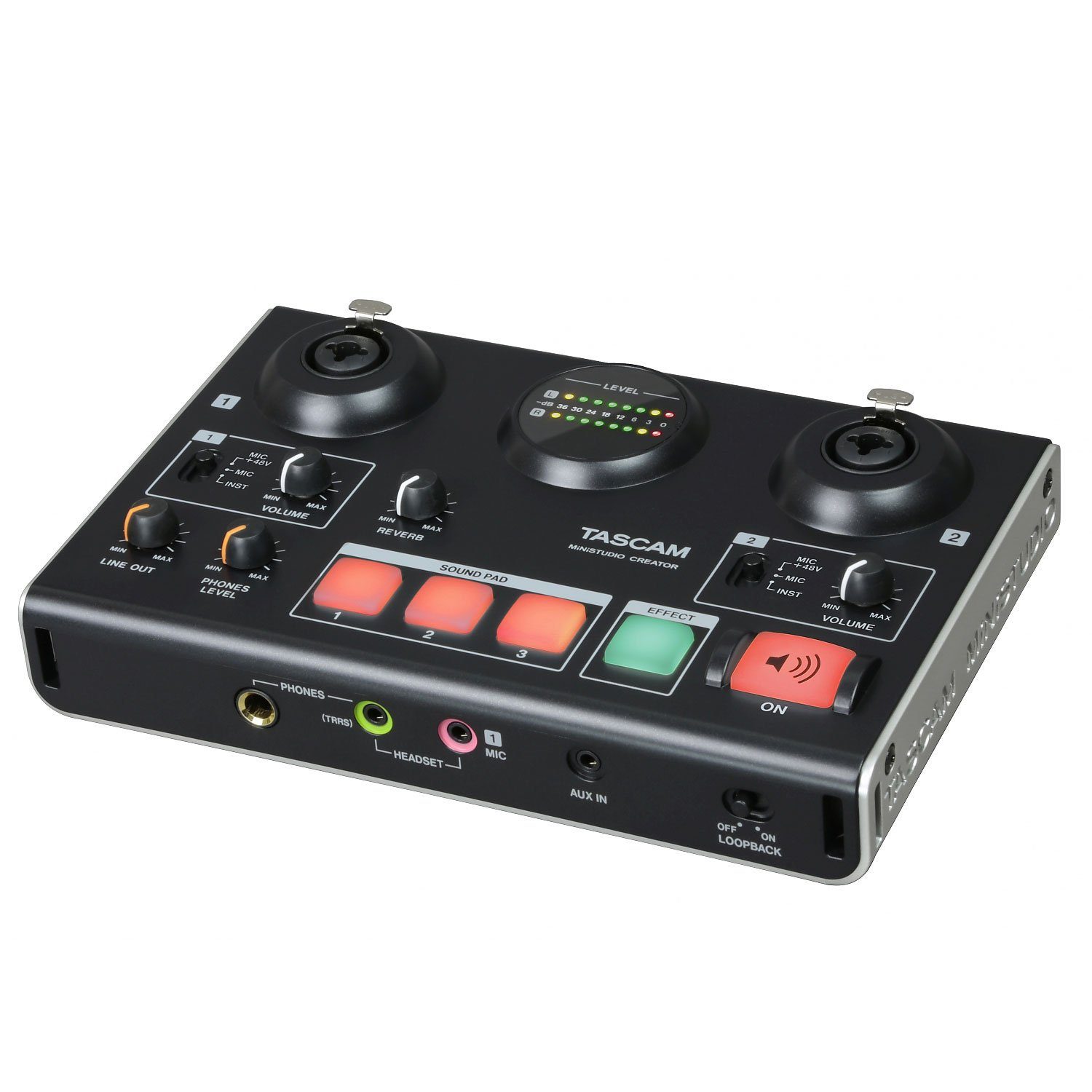 Das Tascam MiniStudio Creator US-42B wurde speziell für die Anforderung von Streamern, Broadcastern, Podcastern und YouTubern entwickelt. Das Ministudio mit integriertem Audio-Interface bietet 2 XLR-Kombibuchsen zum Anschluss zweier Mikrofone sowie zwei 3,5mm Klinkenbuchsen zum Anschluss eines Headsets. Für Kondensatormikrofone kann die nötige Phantomspeisung zugeschaltet werden. Jeder Kanal verfügt über einen Volume-Regler - über einen Schieberegler wählt man ob ein dynamisches Mikrofon benutzt wird, ein Kondensatormikrofon oder ein Instrument wie z.B. eine Gitarre.