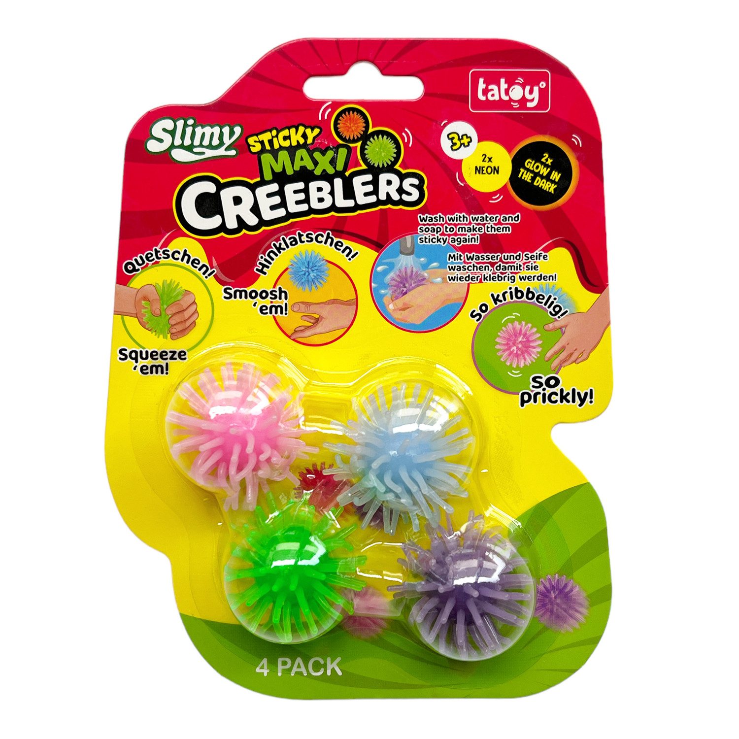 NEU! Der bunte, klebrige Spielspaß mit den Slimy® Sticky Maxi Creeblers von tatoy®! Vier extragroße Slimy® Creeblers Klebebälle zum Drücken, Quetschen und überall Hinwerfen! Der Spielspaß für Groß und Klein! Eine von zwei bunt leuchtenden Farbkombinationen als Überraschung! Art.Nr.: 53307 Tatoy Slimy Maxi Creeblers - verschiedene Farben sortiert 2 x Neon und 2 x Glow in the Dark Geeignet ab 3 Jahren