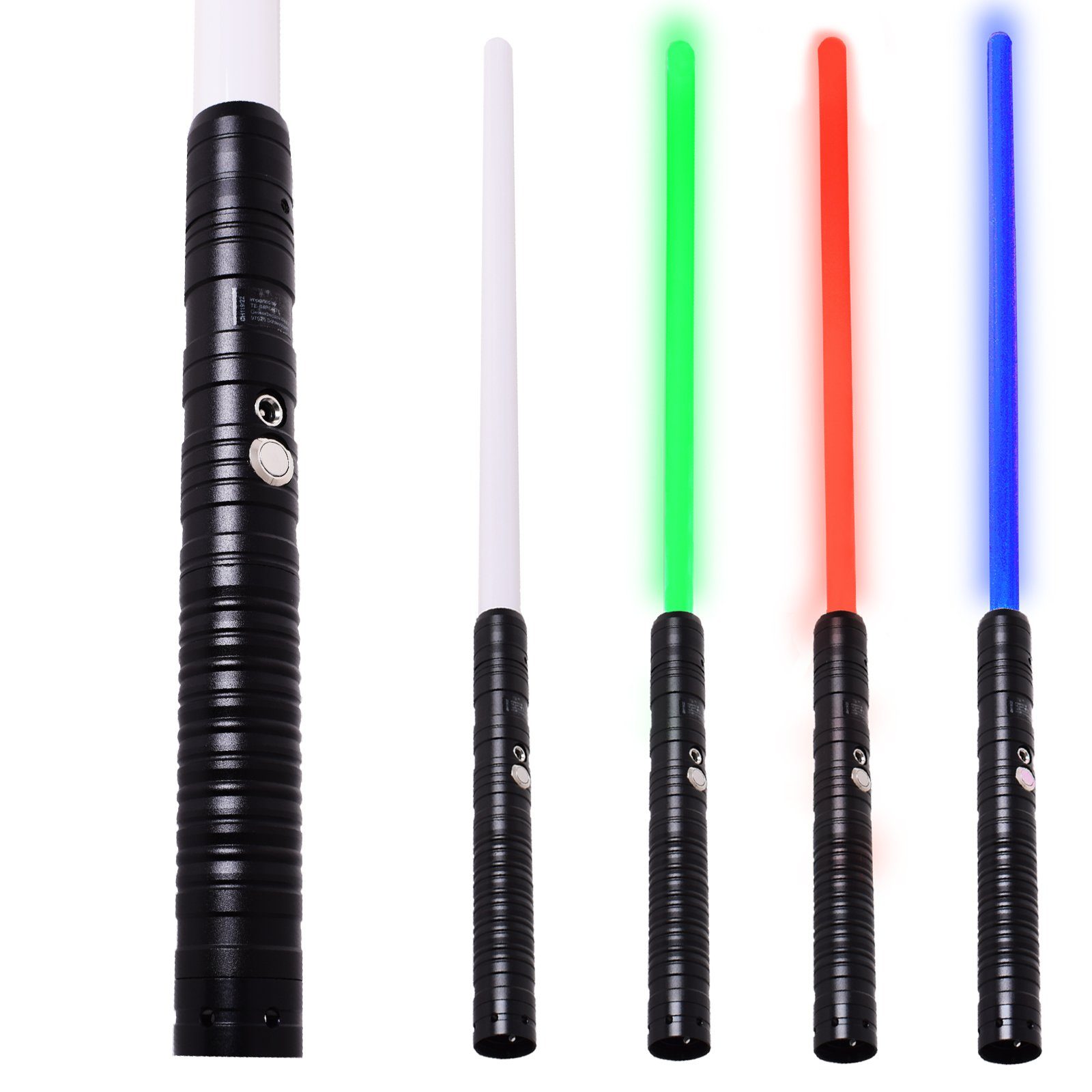 TE-Trend Laserschwert in einer besonders edlen Premium Metall Edition, einer hochwertigen Steuerungseinheit und einem Drucksensor der bei Berührung mit der „Klinge“ entsprechende „Kampfgeräusche simuliert. Das Lichtschwert hat 12 LED Lichtmodi, selbstverständlich auch in den bekannten Farben Grün, Blau und Rot. Die besonders intensive LED lässt das Schwert auch bei Tageslicht in den gewählten Farben hell erleuchten. Der aufladbare Akku lässt sich über das mitgelieferte USB Kabel wieder aufladen. Die Gesamtlänge des Lichtschwertes beträgt 78 cm, hierbei entfallen 24,5 cm auf den massiven Schwertgriff aus Metall. Dadurch besteht die Möglichkeit das Schwert auch beidhändig zu führen.