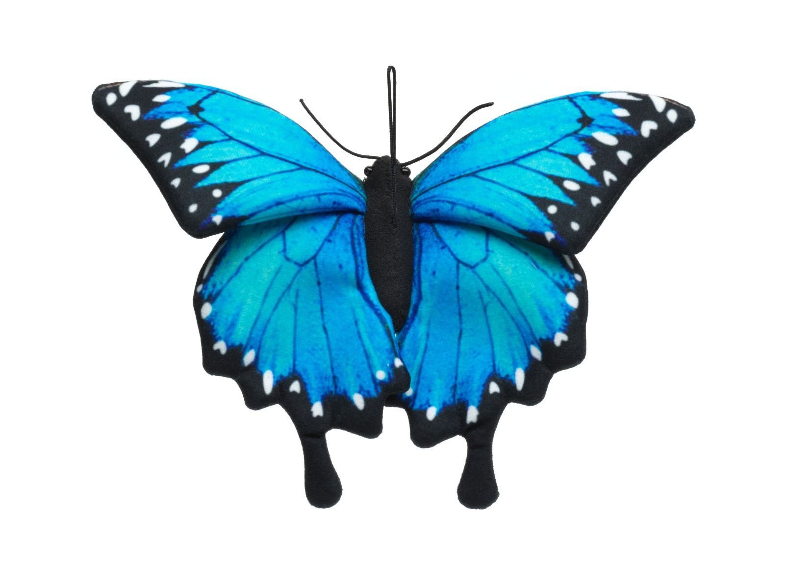 Die Kombination aus strahlendem Blau und elegantem Schwarz macht diesen Plüsch-Schmetterling zu einem auffälligen und attraktiven Kuscheltier. Die Farben sind sorgfältig gewählt, um die natürliche Schönheit eines echten Schmetterlings nachzuahmen.