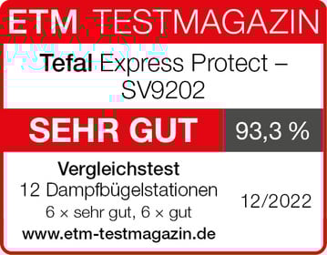 Die Tefal Pro Express Protect – SV9202 erzielt im Vergleichstest des „ETM TESTMAGAZINS“ mit elf weiteren Dampfbügelstationen das Gesamtergebnis „sehr gut (93,3 %)“. Das „sehr gute“ Bügelergebnis überzeugt auf allen Textilien. Das Gerät bietet u. a. ein „sehr gutes“ Gleitverhalten, eine sehr kurze Vorheizzeit und einen leicht befüllbaren Tank. Es ist sehr sicher. Außerdem punktet die „sehr gute“ Ausstattung. Insgesamt gehört die Dampfbügelstation zum oberen Mittelfeld des starken Testspektrums.