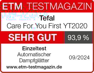 Der Tefal Care For You First YT2020 erzielt im Einzeltest des „ETM TESTMAGAZINS“ das Gesamtergebnis „sehr gut (93,9 %)“. Die Funktionalität ist „sehr gut“: Das Gerät glättet alle getesteten Textilien hervorragend und auch die Geruchsbeseitigung klappt „sehr gut“. Es ist sehr einfach zu bedienen, zu reinigen und zu transportieren. Außerdem glänzt die hervorragende Ausstattung u. a. mit einem „sehr guten“ Display, hochwertiger Verarbeitung und einem sehr großen Tankvolumen. Insgesamt ermöglicht das Gerät eine „schnelle & simple Faltenglättung“.