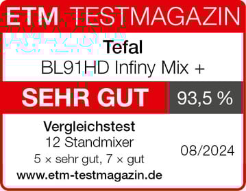 Der Tefal BL91HD Infiny Mix + erzielt im Vergleichstest des „ETM TESTMAGAZINS“ mit elf weiteren Standmixern das Gesamtergebnis „sehr gut (93,5 %)“. Die „sehr gute“ Leistung glänzt beim Pürieren, Mahlen und Zerstoßen. Das Gerät ist sehr einfach zu bedienen und „gut“ zu reinigen. Außerdem sind die Sicherheitsmechanismen hervorragend. Insgesamt erreicht das Modell das drittbeste Testergebnis.